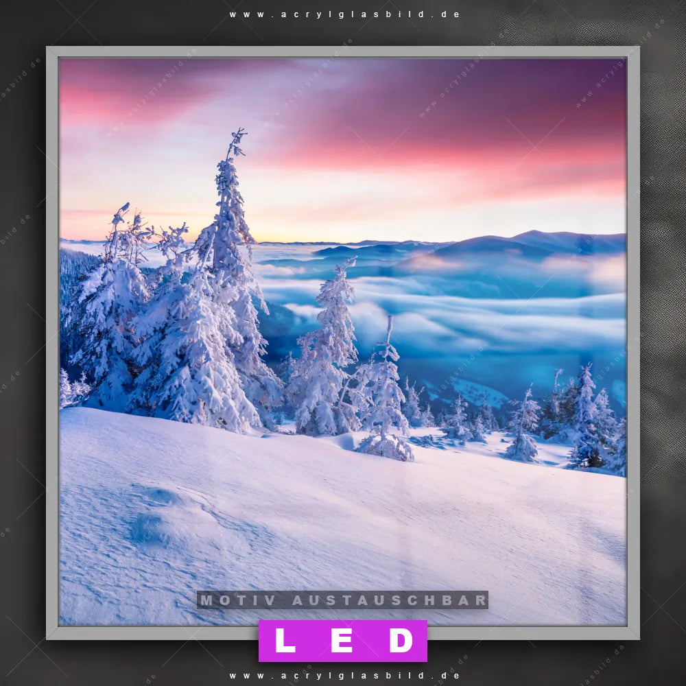 Bist du bereit, deine Wände mit einem dimmbaren LED Bild mit Fernbedienung und optionaler Farbtemperatursteuerung zum Leuchten zu bringen? Wir haben das ultimative Landschaften, Winter LED Acrylglasbild Canvalight® DIA für dich! Unser LED Wandbild aus Acrylglas Sonnenaufgang im Schnee im Quadratischen Format mit austauschbarer bedruckter Acrylglas-Scheibe im DIA-Klapprahmen bringt sofort jede Menge Glanz in deine vier Wände.