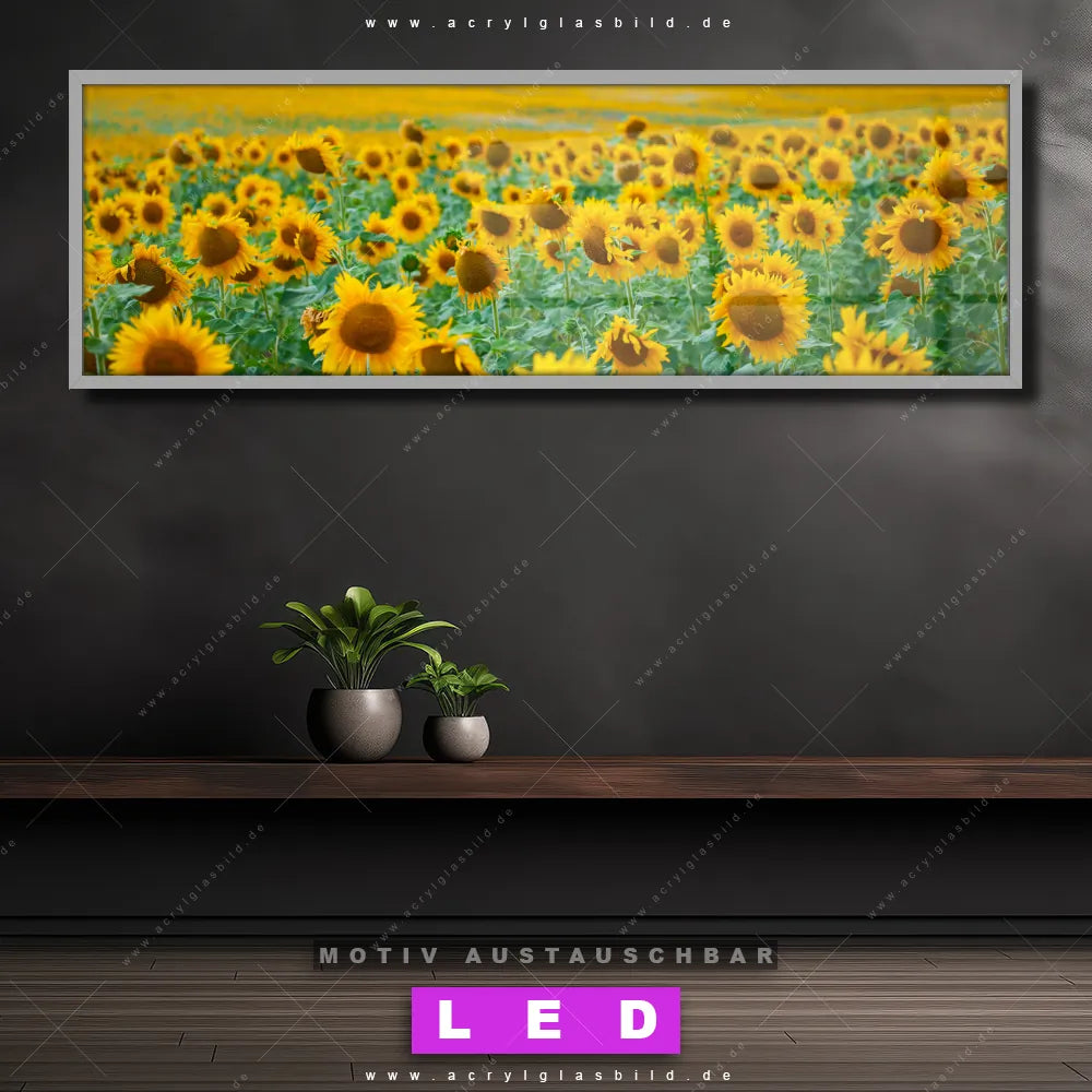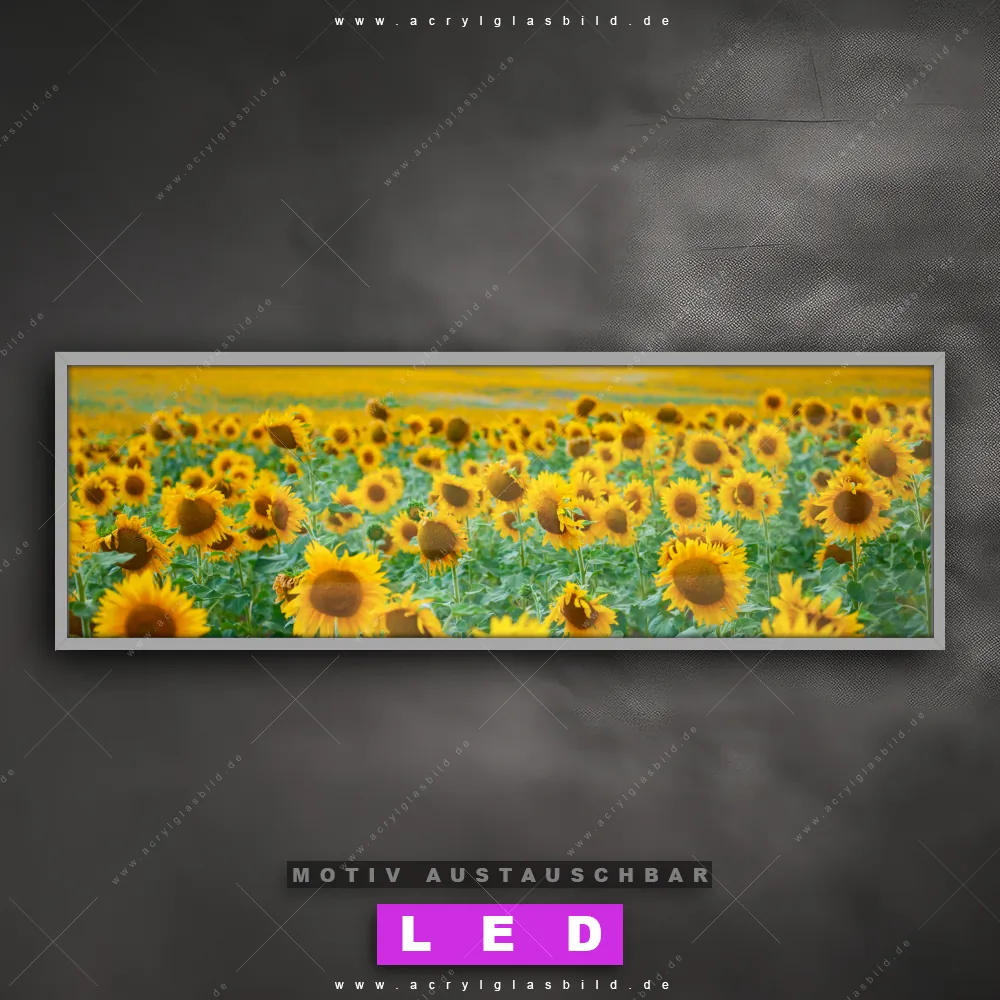 Deine Wände könnten dringend ein dimmbares LED Bild mit Fernbedienung und optionaler Farbtemperatursteuerung gebrauchen? Dann haben wir das perfekte Wandbild mit LED Beleuchtung für dich: unser mega-cooles Landschaften, Blumen - Botanik Canvalight® DIA LED Acrylglasbild! Mit unserem angesagten Leuchtbild aus Acrylglas im Panorama-Format und der austauschbaren bedruckten Acrylglas-Scheibe Sonnenblumenfeld bringst du nicht nur Licht, sondern auch jede Menge Flair in deine Räume.