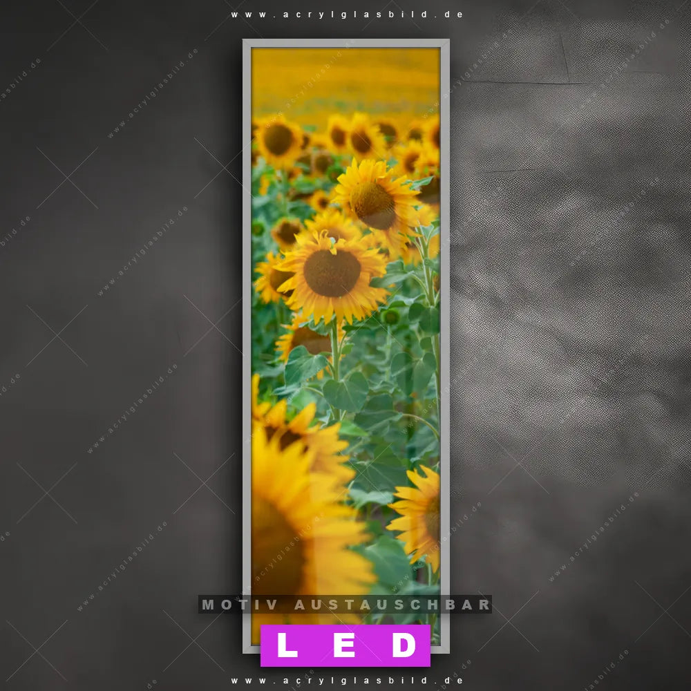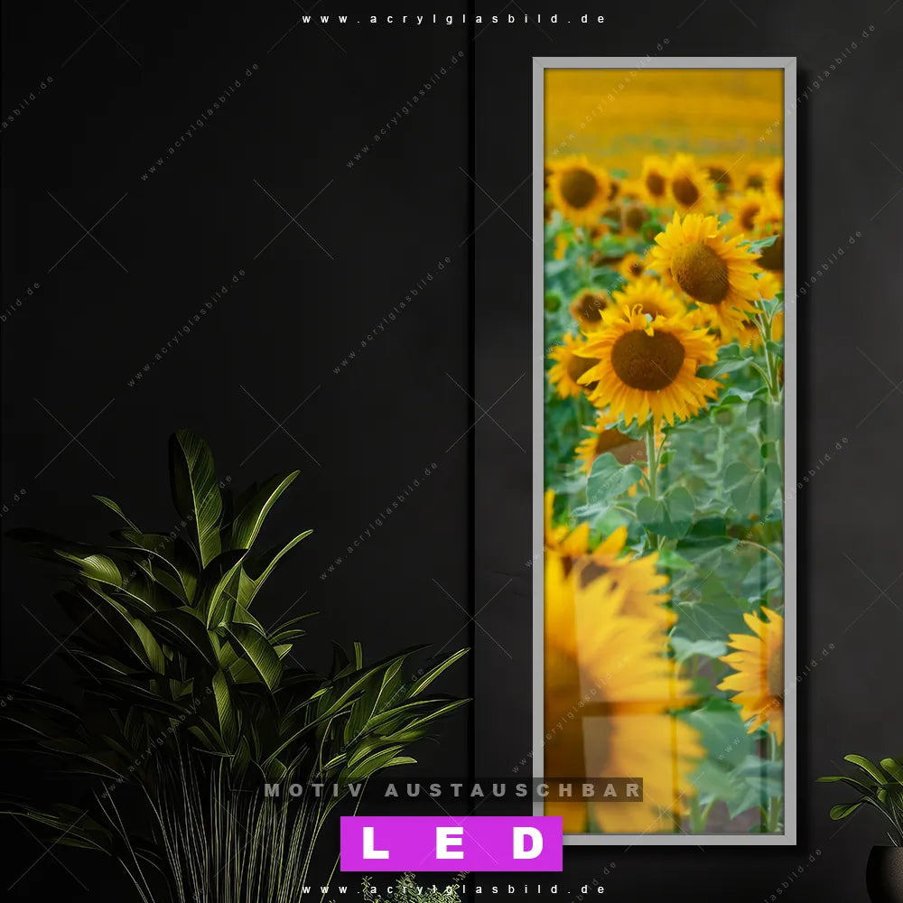 Bist du bereit, deine Wände mit einem dimmbaren LED Bild mit Fernbedienung und optionaler Farbtemperatursteuerung auf das nächste Level zu bringen? Unser Landschaften, Blumen - Botanik Canvalight® DIA LED Acrylglasbild ist genau das, was du brauchst! Das Wandbild mit LED Beleuchtung im Schmalen Format mit austauschbarer bedruckter Acrylglas-Scheibe Sonnenblumenfeld bringt Licht und Stil in dein Zuhause – und das in null Komma nichts!