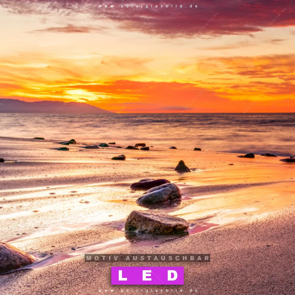 Wer braucht schon langweilige Wände, wenn man sie mit unserem LED Acrylglasbild Canvalight® DIA Sonnenuntergang am Strand aufpeppen kann? Dank der genialen LED-Ausleuchtung wirst du in Arzt - Praxis, Büro - Kanzlei, Wohnzimmer - Schlafzimmer, Bar - Gastronomie, Badezimmer, Flur - Eingangsbereich nie wieder über deine eigenen Füße stolpern. Wenn du nach einem beleuchteten Wandbild aus Acrylglas mit Felsen, Sommer, Ostsee - Nordsee, Sonnenuntergang - Sonnenaufgang, Urlaub - Reisen, Steine, Deutschland, Herbst suchst, dann ist unser LED Acrylglasbild Felsen am Strandufer in den hammermäßigen Motiv-Farben Lila, Orange, Blau, Rot genau das richtige LED Bild für dich. Im coolen Natürlich - Realistisch, Modern Art Stil gestaltet, passt das LED Leuchtbild mit DIA-Klapprahmen und glänzender Front aus Acrylglas perfekt zu jedem Einrichtungsstil – sogar zu deinem chaotischen Kreativlabor!