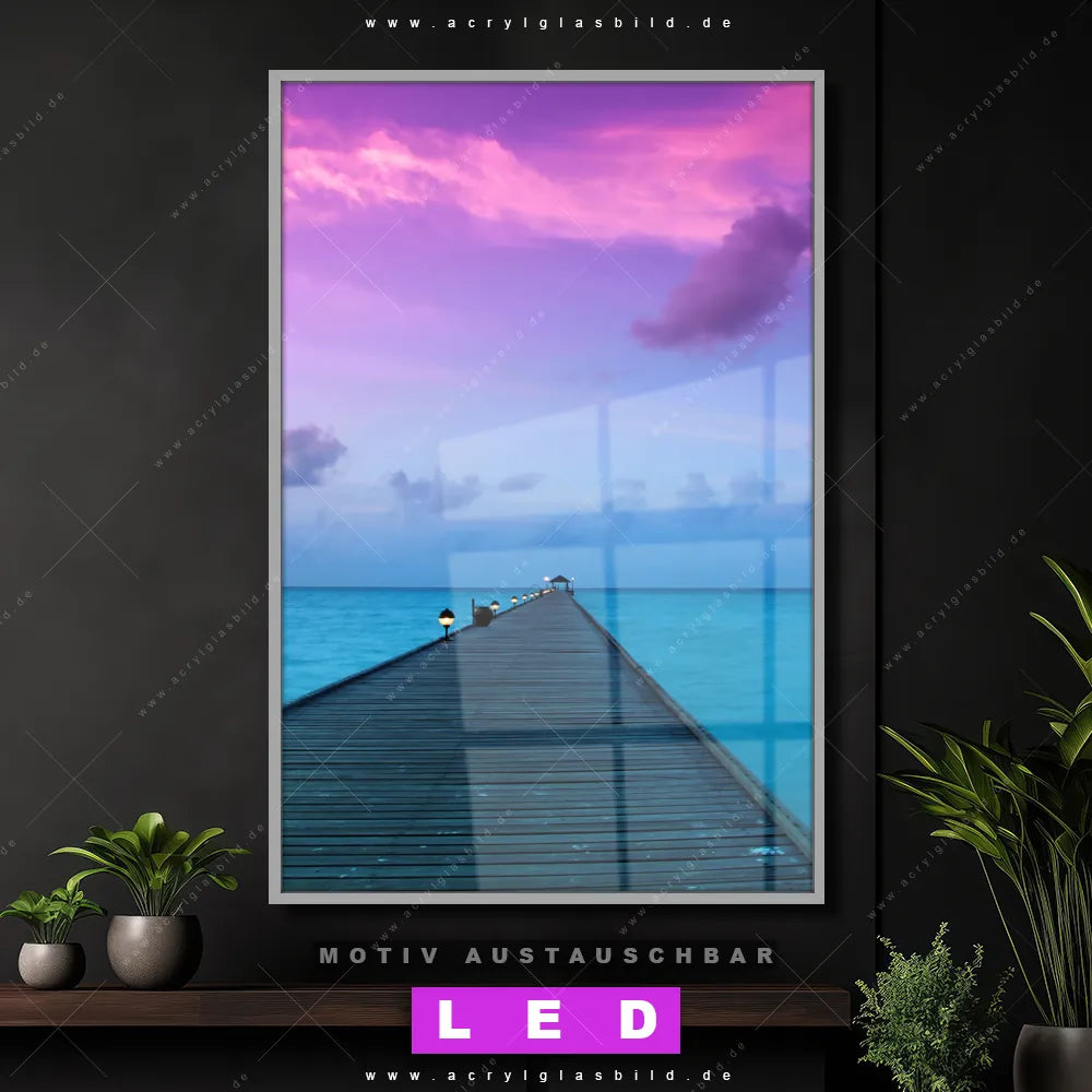 Du suchst nach einem Wandbild mit LED Beleuchtung als ultimativen Hingucker für deine Wände? Dann haben wir das perfekte dimmbare LED Bild mit Fernbedienung und optionaler Farbtemperatursteuerung für dich: unser abgefahrenes Strand - Meer Canvalight® DIA LED Acrylglasbild! Mit dem LED Leuchtbild aus Acrylglas Sonnenuntergang auf den Malediven im Hochformat mit austauschbarer bedruckter Acrylglas-Scheibe bringst du nicht nur Licht, sondern auch ordentlich Stil in deine Bude.