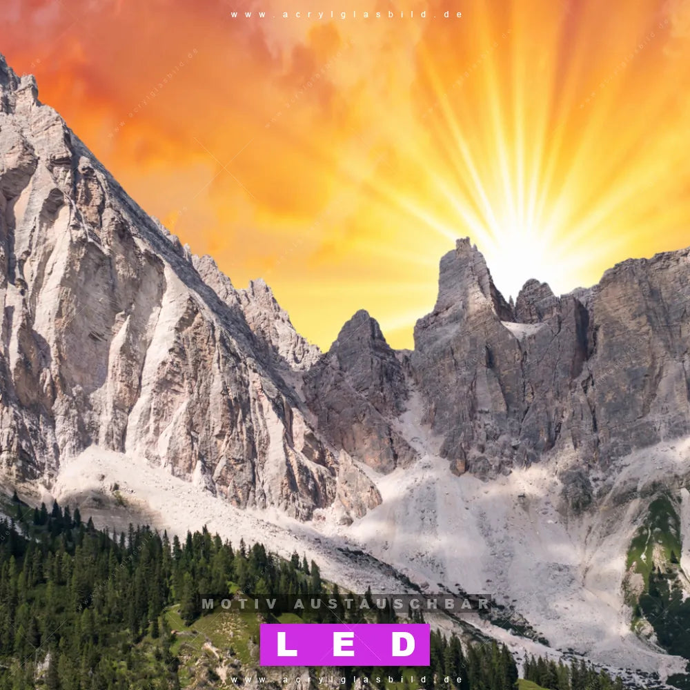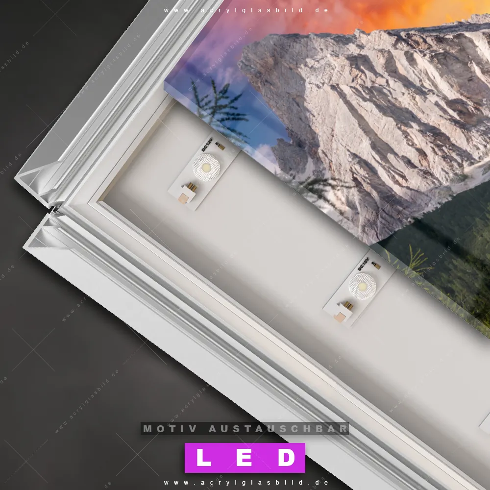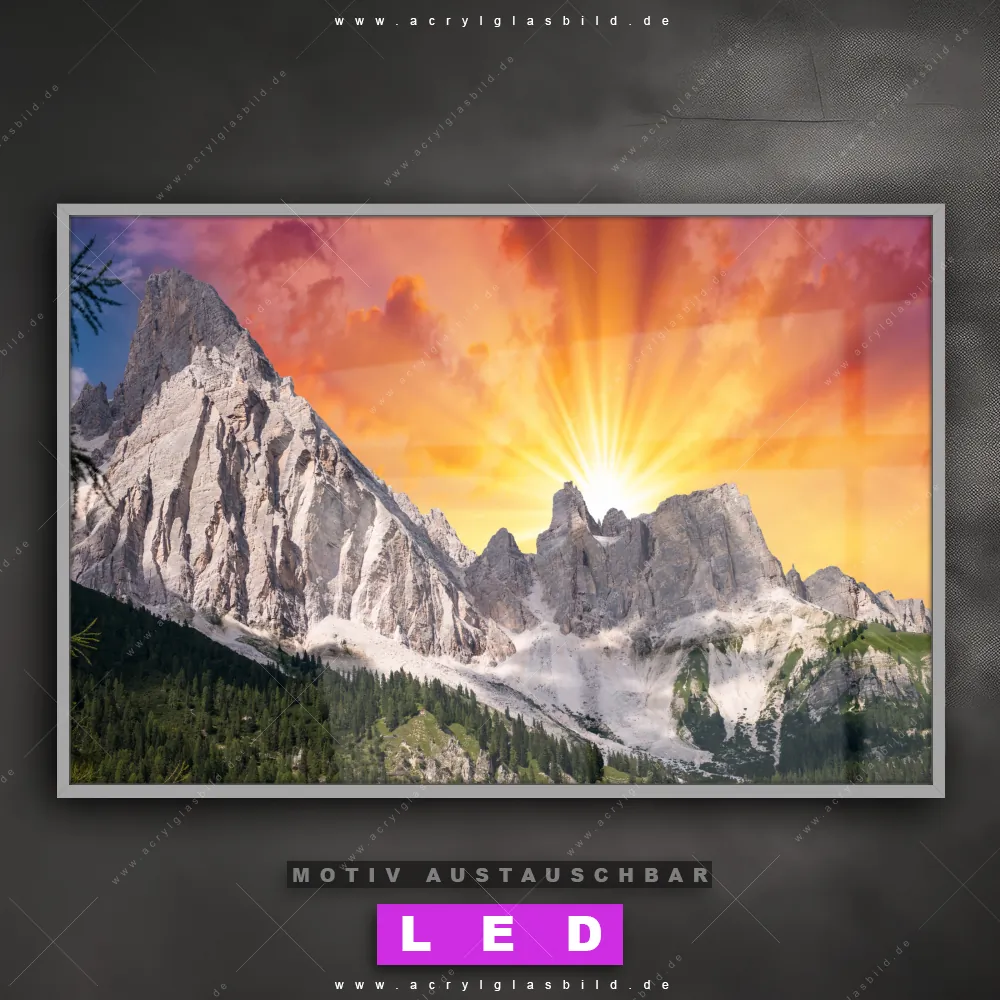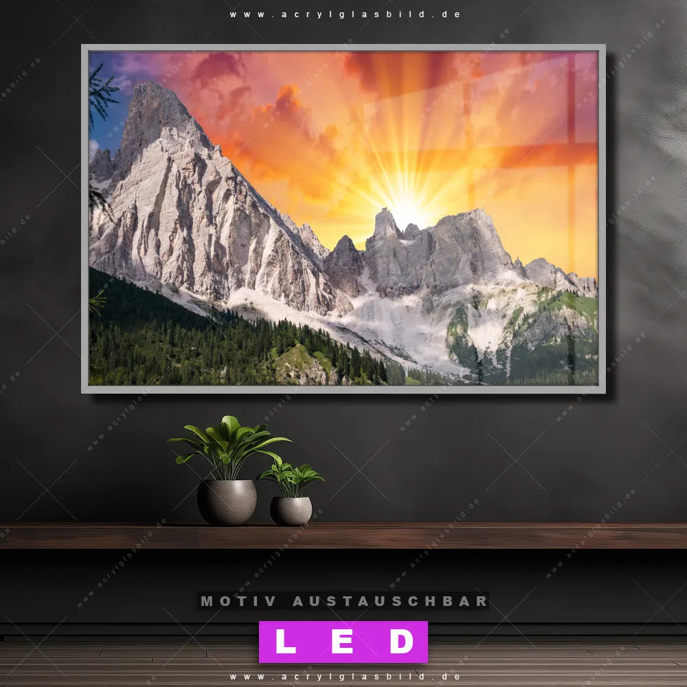 Du bist auf der Suche nach einem dimmbaren Landschaften LED Bild mit Fernbedienung und optionaler Farbtemperatursteuerung? Dann haben wir hier genau das richtige Wandbild mit LED Beleuchtung für dich: Unser Canvalight® DIA LED Acrylglasbild Sonnenuntergang in den Bergen im Querformat mit austauschbarer bedruckter Acrylglas-Scheibe. Dieses Leuchtbild bringt sofort Partybeleuchtung in deine Räume!