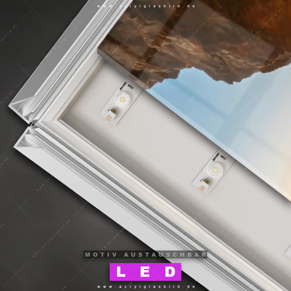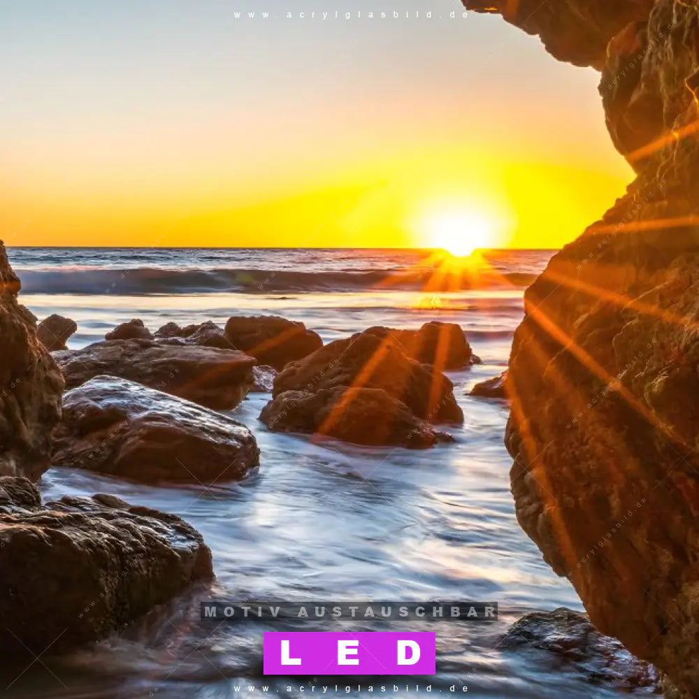 Bist du bereit, deine Wände mit einem dimmbaren LED Bild mit Fernbedienung und optionaler Farbtemperatursteuerung auf das nächste Level zu bringen? Unser Landschaften, Strand - Meer Canvalight® DIA LED Acrylglasbild ist genau das, was du brauchst! Das Wandbild mit LED Beleuchtung im Schmalen Format mit austauschbarer bedruckter Acrylglas-Scheibe Sonnenuntergang in Meeresgrotte bringt Licht und Stil in dein Zuhause – und das in null Komma nichts!