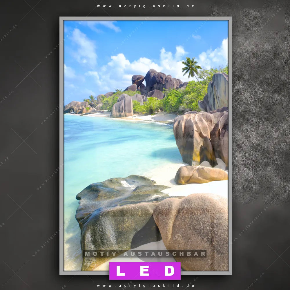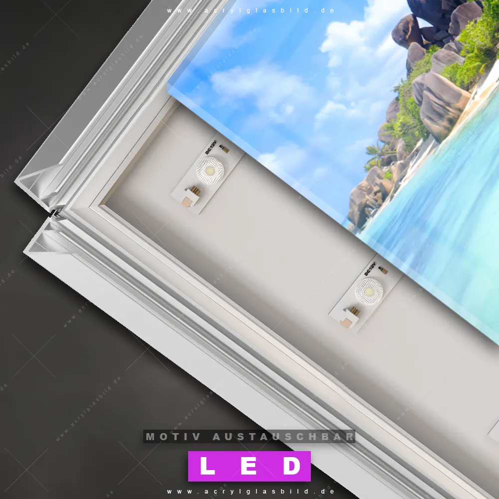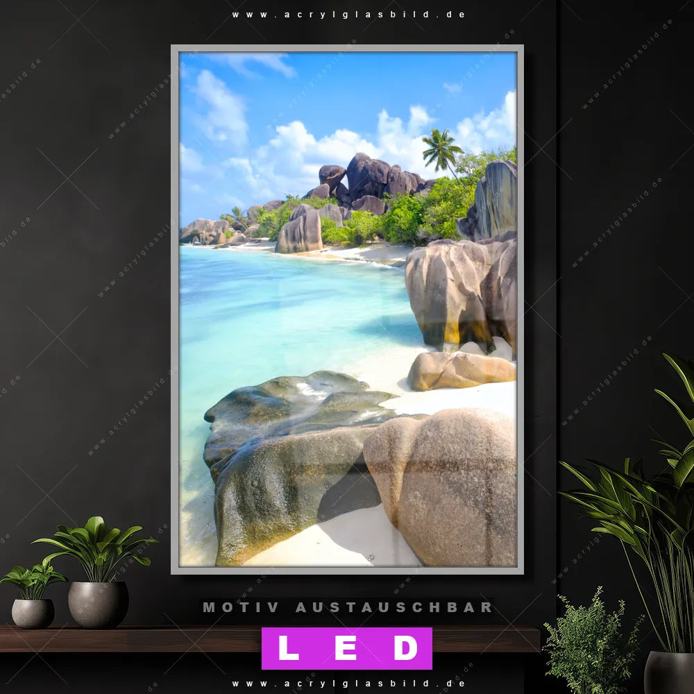 Du suchst nach einem Wandbild mit LED Beleuchtung als ultimativen Hingucker für deine Wände? Dann haben wir das perfekte dimmbare LED Bild mit Fernbedienung und optionaler Farbtemperatursteuerung für dich: unser abgefahrenes Landschaften, Strand - Meer Canvalight® DIA LED Acrylglasbild! Mit dem LED Leuchtbild aus Acrylglas Südsee Paradies im Hochformat mit austauschbarer bedruckter Acrylglas-Scheibe bringst du nicht nur Licht, sondern auch ordentlich Stil in deine Bude.