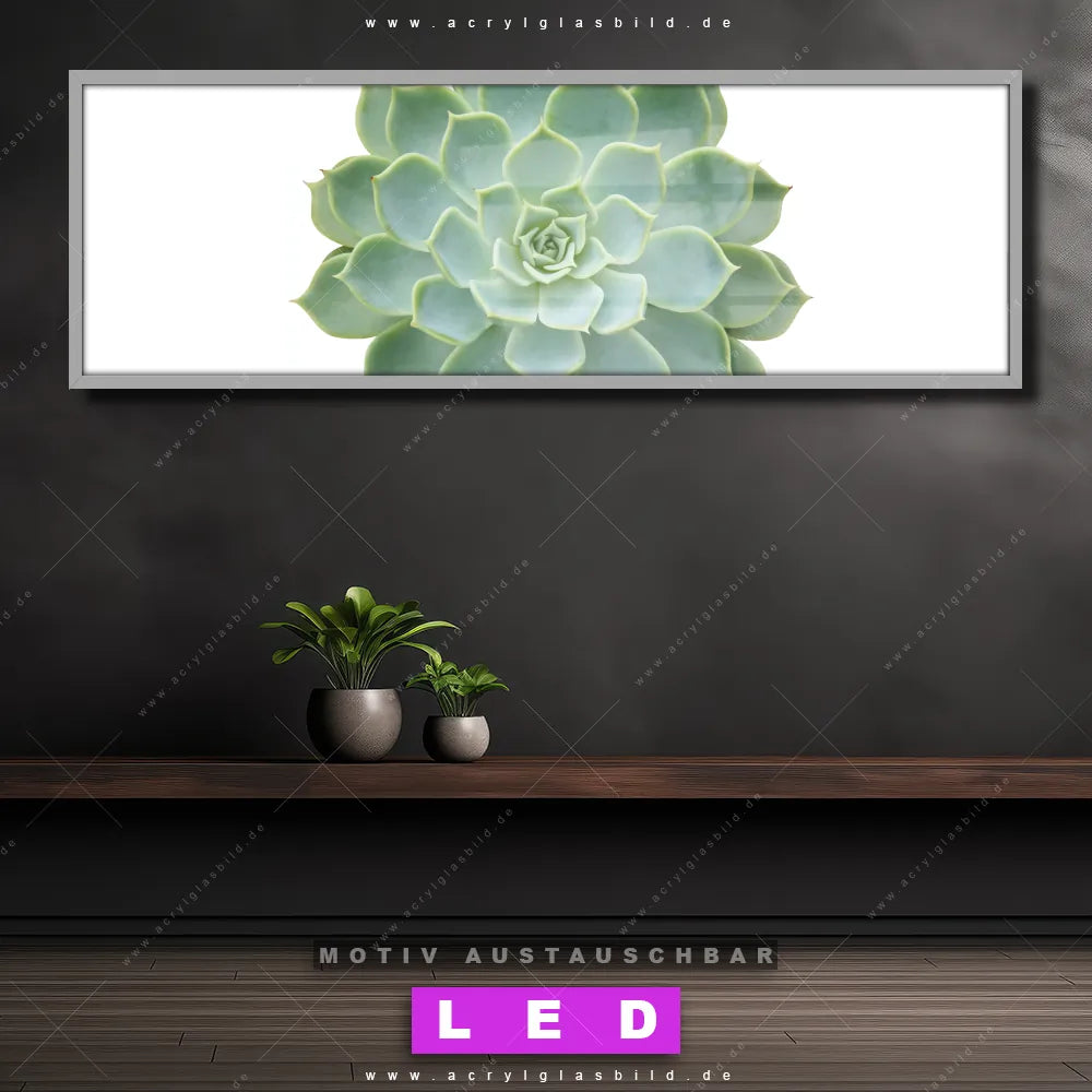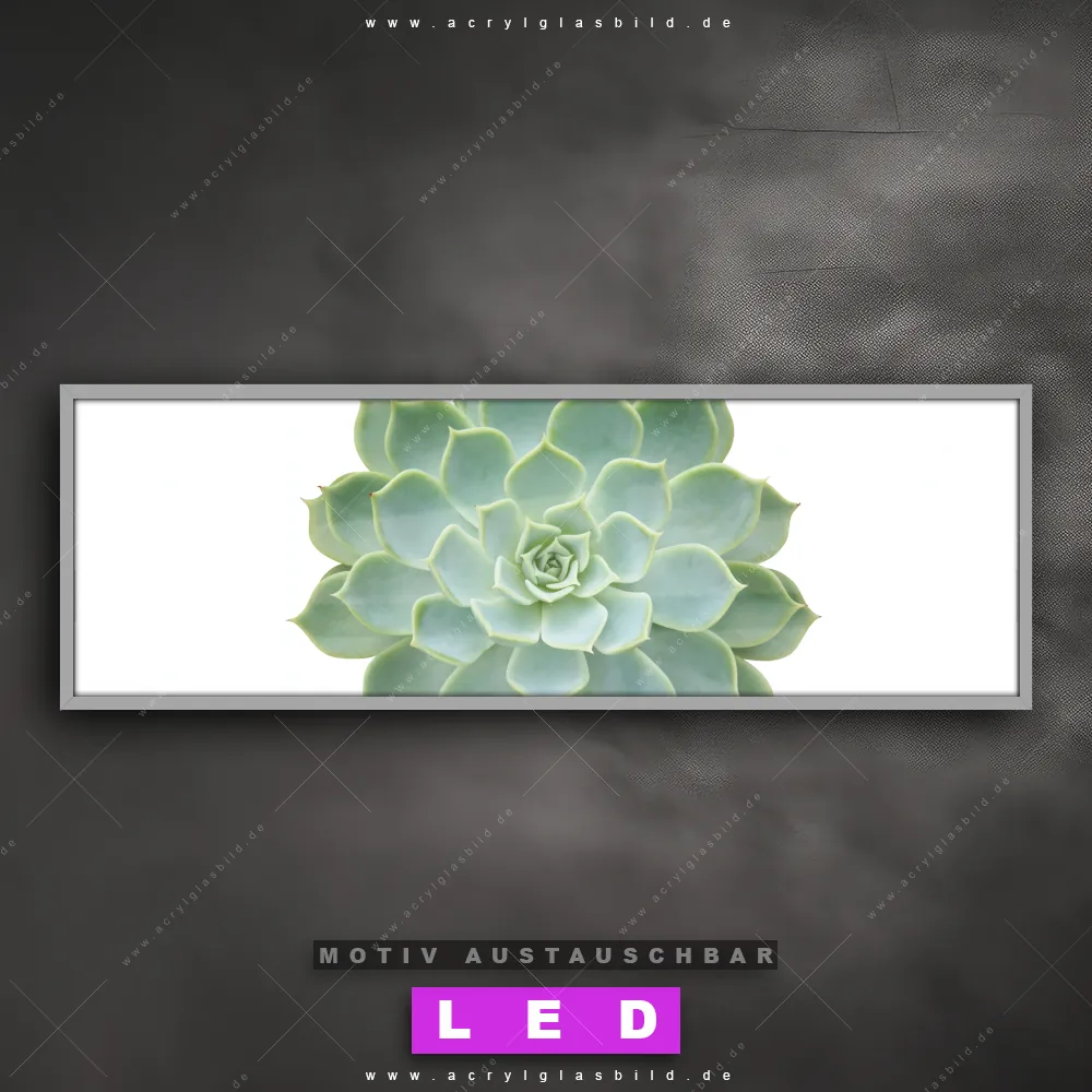 Deine Wände könnten dringend ein dimmbares LED Bild mit Fernbedienung und optionaler Farbtemperatursteuerung gebrauchen? Dann haben wir das perfekte Wandbild mit LED Beleuchtung für dich: unser mega-cooles Blumen - Botanik Canvalight® DIA LED Acrylglasbild! Mit unserem angesagten Leuchtbild aus Acrylglas im Panorama-Format und der austauschbaren bedruckten Acrylglas-Scheibe Sukkulente No.2 bringst du nicht nur Licht, sondern auch jede Menge Flair in deine Räume.