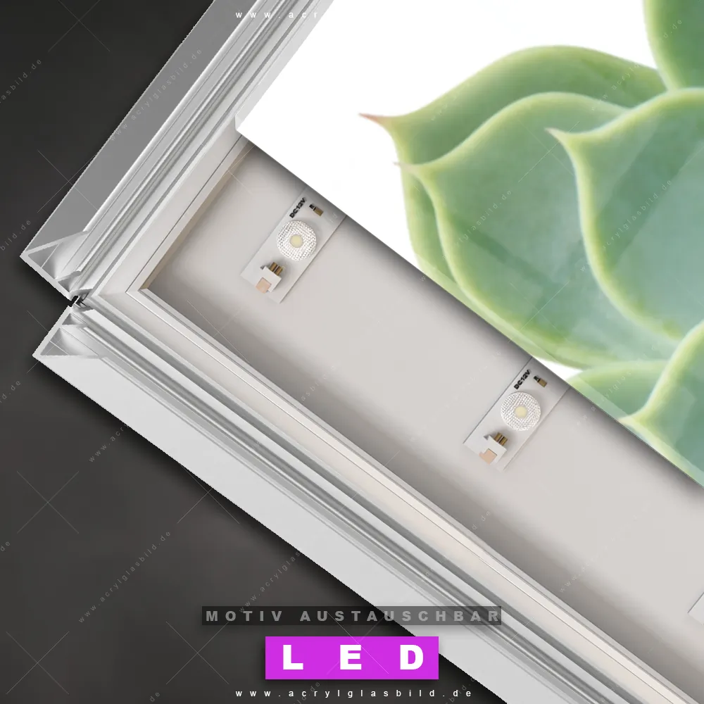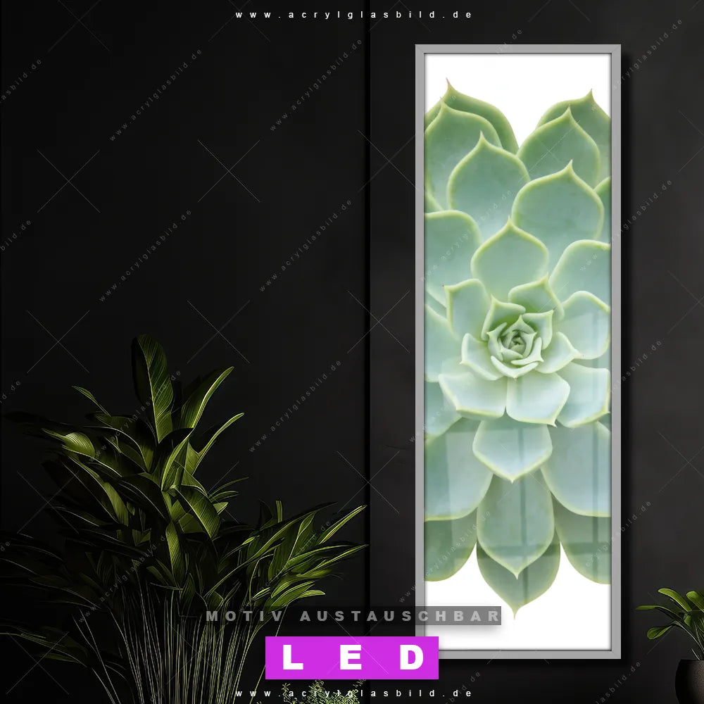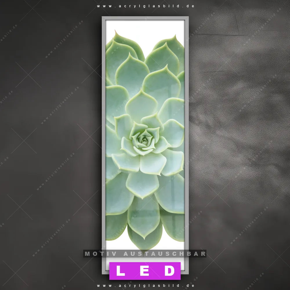 Bist du bereit, deine Wände mit einem dimmbaren LED Bild mit Fernbedienung und optionaler Farbtemperatursteuerung auf das nächste Level zu bringen? Unser Blumen - Botanik Canvalight® DIA LED Acrylglasbild ist genau das, was du brauchst! Das Wandbild mit LED Beleuchtung im Schmalen Format mit austauschbarer bedruckter Acrylglas-Scheibe Sukkulente No.2 bringt Licht und Stil in dein Zuhause – und das in null Komma nichts!
