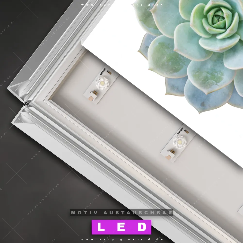 Also, worauf wartest du noch? Gib mit einem beleuchteten Wandbild mit wechselbarer Acrylglas-Scheibe deinen Wänden das gewisse Etwas und bestelle jetzt das LED Acrylglasbild Canvalight® DIA Sukkulente in Mint-, Blau-, Grüntönen – dein Zuhause wird es dir danken und deine Freunde werden dank der wechselbaren Motive erblassen!