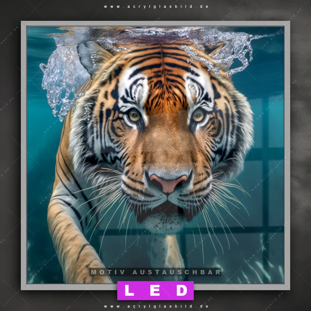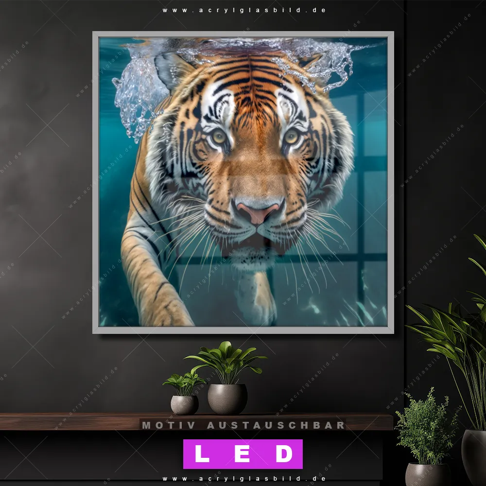 Bist du bereit, deine Wände mit einem dimmbaren LED Bild mit Fernbedienung und optionaler Farbtemperatursteuerung zum Leuchten zu bringen? Wir haben das ultimative Tierwelt LED Acrylglasbild Canvalight® DIA für dich! Unser LED Wandbild aus Acrylglas Tauchender Tiger im Quadratischen Format mit austauschbarer bedruckter Acrylglas-Scheibe im DIA-Klapprahmen bringt sofort jede Menge Glanz in deine vier Wände.
