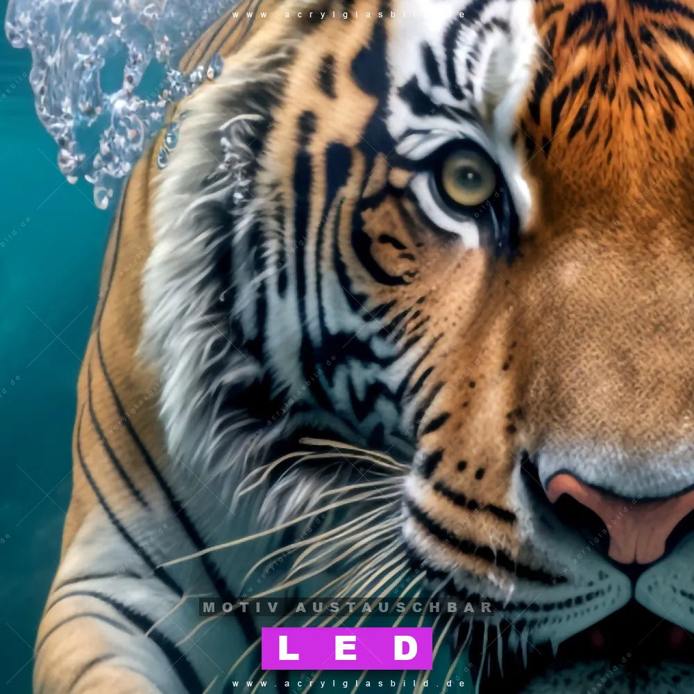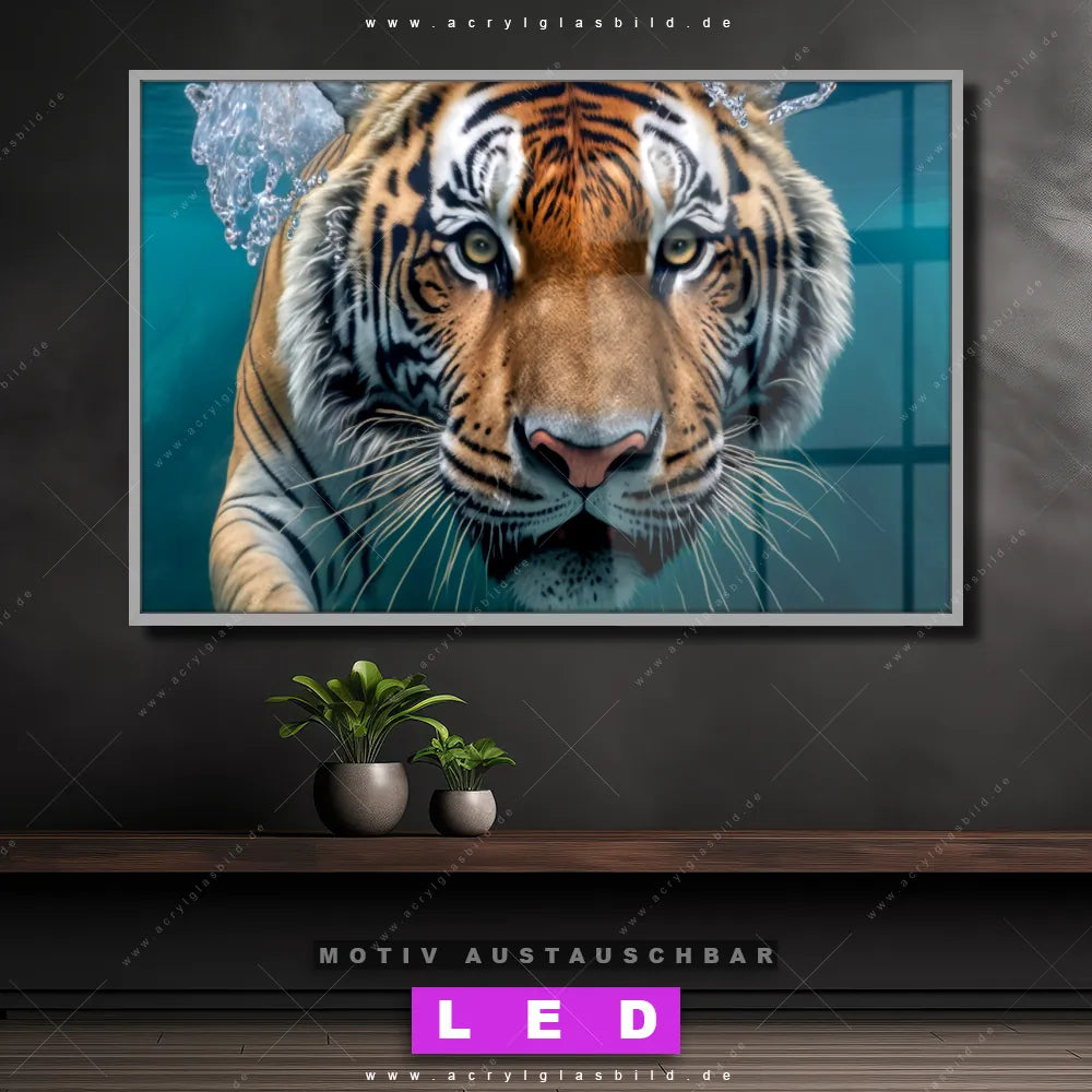 Du bist auf der Suche nach einem dimmbaren Tierwelt LED Bild mit Fernbedienung und optionaler Farbtemperatursteuerung? Dann haben wir hier genau das richtige Wandbild mit LED Beleuchtung für dich: Unser Canvalight® DIA LED Acrylglasbild Tauchender Tiger im Querformat mit austauschbarer bedruckter Acrylglas-Scheibe. Dieses Leuchtbild bringt sofort Partybeleuchtung in deine Räume!