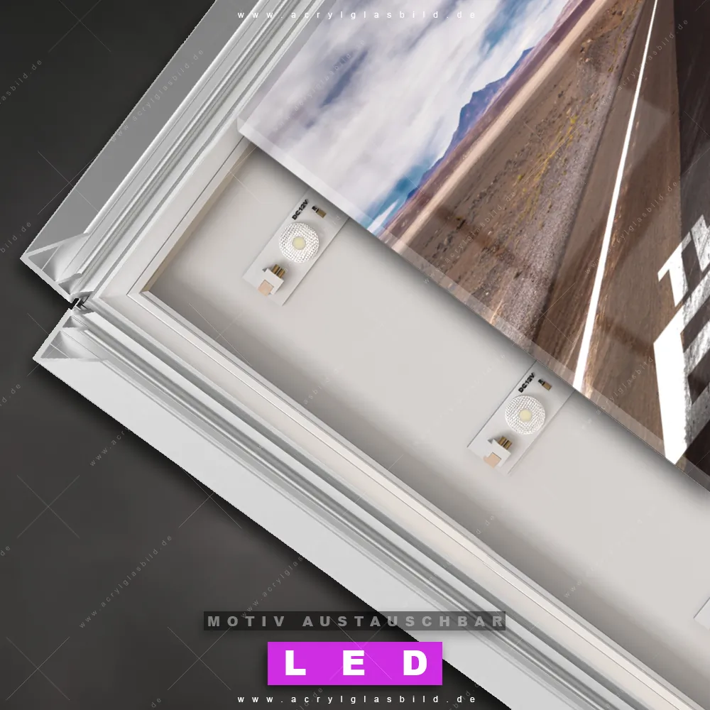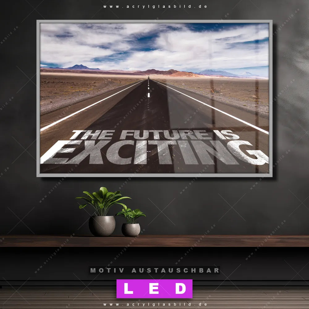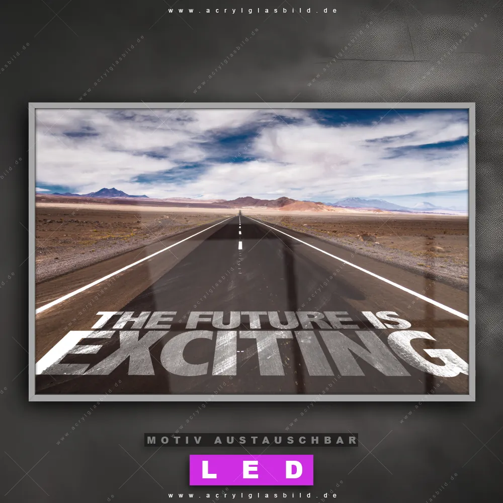 Du bist auf der Suche nach einem dimmbaren Landschaften LED Bild mit Fernbedienung und optionaler Farbtemperatursteuerung? Dann haben wir hier genau das richtige Wandbild mit LED Beleuchtung für dich: Unser Canvalight® DIA LED Acrylglasbild The Future - Motivation im Querformat mit austauschbarer bedruckter Acrylglas-Scheibe. Dieses Leuchtbild bringt sofort Partybeleuchtung in deine Räume!