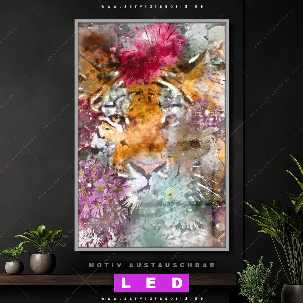 Du suchst nach einem Wandbild mit LED Beleuchtung als ultimativen Hingucker für deine Wände? Dann haben wir das perfekte dimmbare LED Bild mit Fernbedienung und optionaler Farbtemperatursteuerung für dich: unser abgefahrenes Tierwelt, Blumen - Botanik Canvalight® DIA LED Acrylglasbild! Mit dem LED Leuchtbild aus Acrylglas Tiger & Blumen im Hochformat mit austauschbarer bedruckter Acrylglas-Scheibe bringst du nicht nur Licht, sondern auch ordentlich Stil in deine Bude.