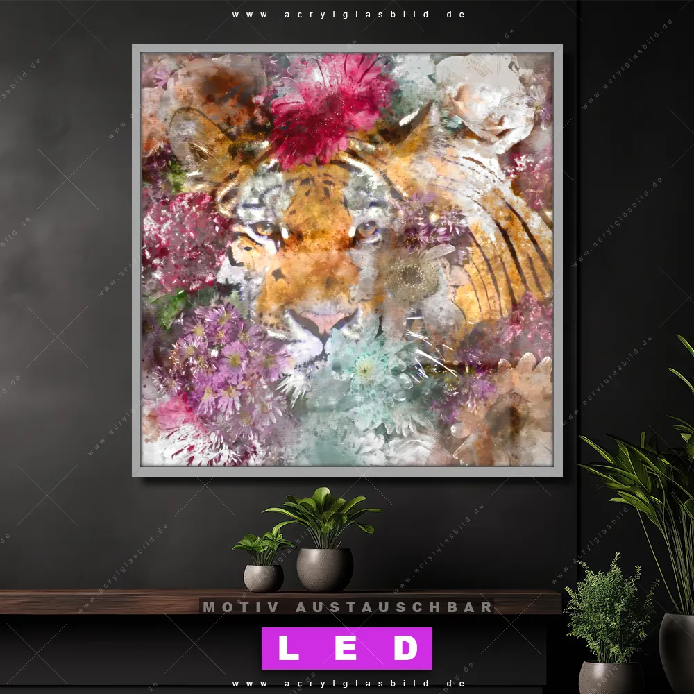 Bist du bereit, deine Wände mit einem dimmbaren LED Bild mit Fernbedienung und optionaler Farbtemperatursteuerung zum Leuchten zu bringen? Wir haben das ultimative Tierwelt, Blumen - Botanik LED Acrylglasbild Canvalight® DIA für dich! Unser LED Wandbild aus Acrylglas Tiger & Blumen im Quadratischen Format mit austauschbarer bedruckter Acrylglas-Scheibe im DIA-Klapprahmen bringt sofort jede Menge Glanz in deine vier Wände.