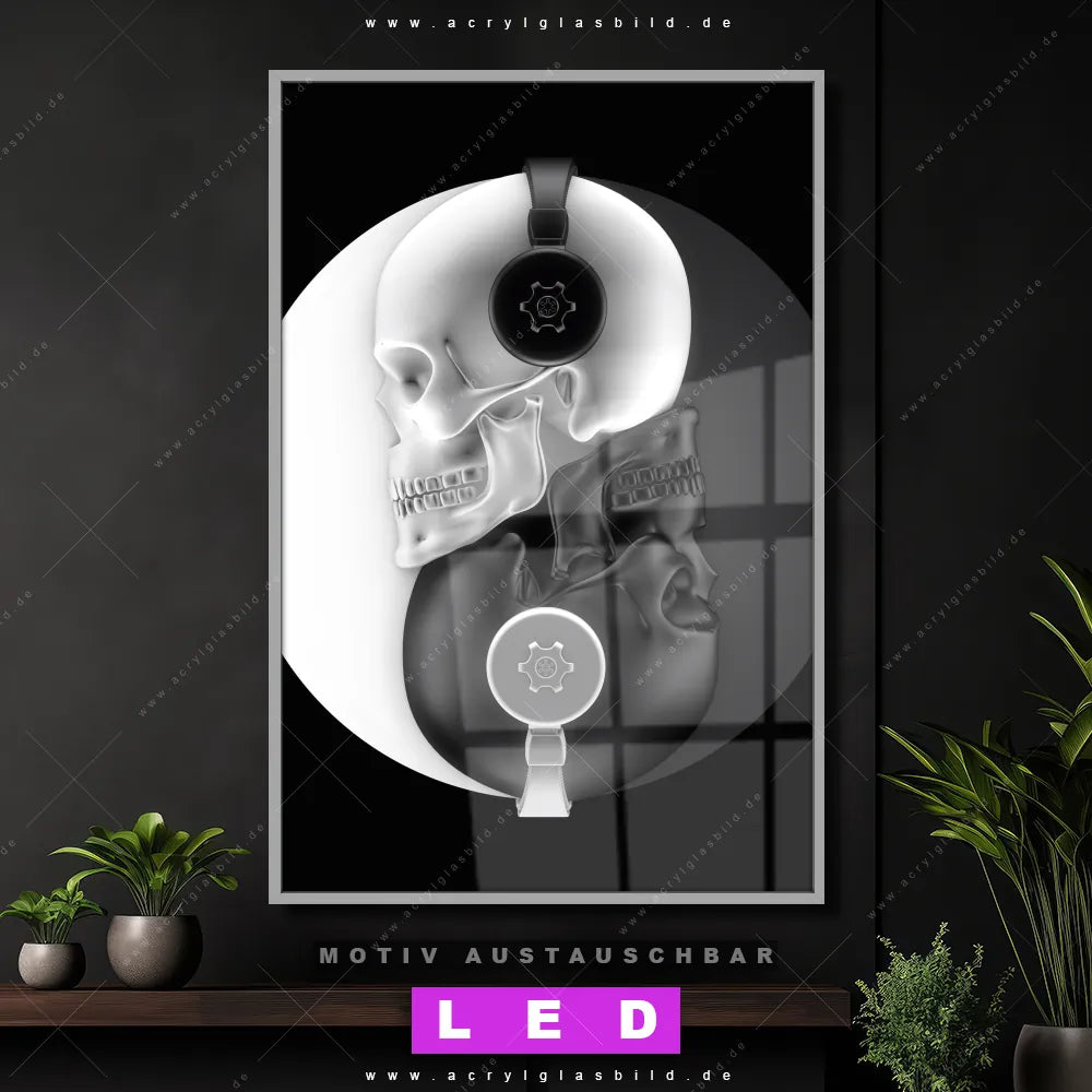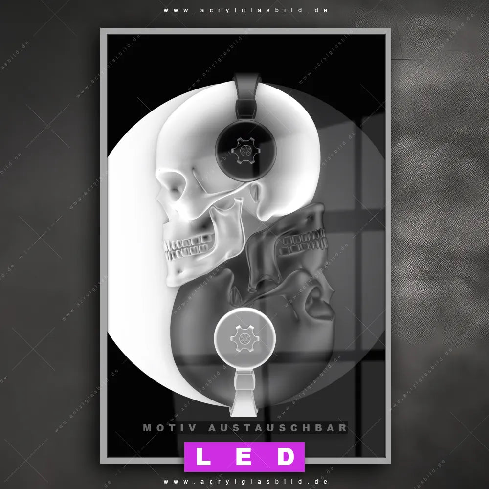Wer braucht schon langweilige Wände, wenn man sie mit unserem LED Acrylglasbild Canvalight® DIA Totenköpfe mit Kopfhörern aufpeppen kann? Dank der genialen LED-Ausleuchtung wirst du in Wohnzimmer - Schlafzimmer, Flur - Eingangsbereich nie wieder über deine eigenen Füße stolpern. Wenn du nach einem beleuchteten Wandbild aus Acrylglas mit Schädel, Totenkopf, Skelett, Yin Yang, Feng Shui, Kopfhörer, Musik suchst, dann ist unser LED Acrylglasbild Symbole sich ergänzender Gegensätze in den hammermäßigen Motiv-Farben Weiss, Schwarz, Grau genau das richtige LED Bild für dich. Im coolen Mixed Media, Modern Art Stil gestaltet, passt das LED Leuchtbild mit DIA-Klapprahmen und glänzender Front aus Acrylglas perfekt zu jedem Einrichtungsstil – sogar zu deinem chaotischen Kreativlabor!