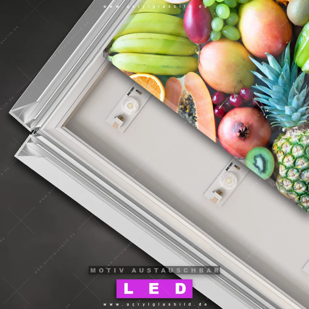 Also, worauf wartest du noch? Gib mit einem beleuchteten Wandbild mit wechselbarer Acrylglas-Scheibe deinen Wänden das gewisse Etwas und bestelle jetzt das LED Acrylglasbild Canvalight® DIA exotisches Obst – dein Zuhause wird es dir danken und deine Freunde werden dank der wechselbaren Motive erblassen!