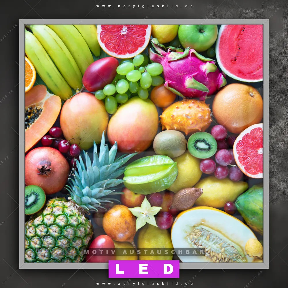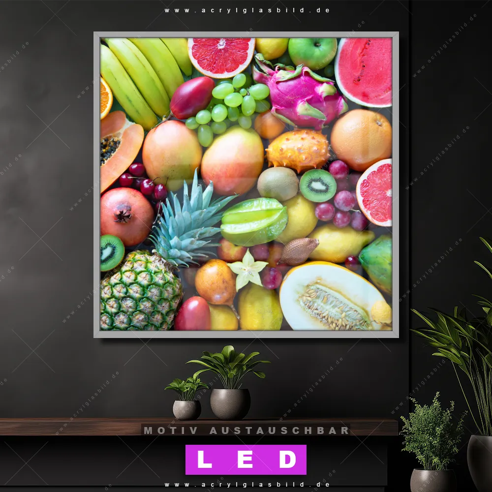 Bist du bereit, deine Wände mit einem dimmbaren LED Bild mit Fernbedienung und optionaler Farbtemperatursteuerung zum Leuchten zu bringen? Wir haben das ultimative Essen - Trinken LED Acrylglasbild Canvalight® DIA für dich! Unser LED Wandbild aus Acrylglas Tropische Früchte im Quadratischen Format mit austauschbarer bedruckter Acrylglas-Scheibe im DIA-Klapprahmen bringt sofort jede Menge Glanz in deine vier Wände.