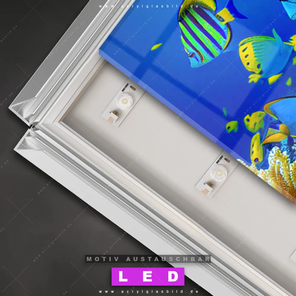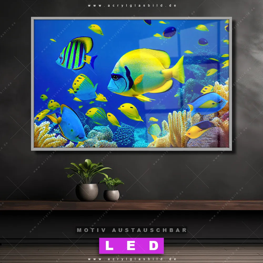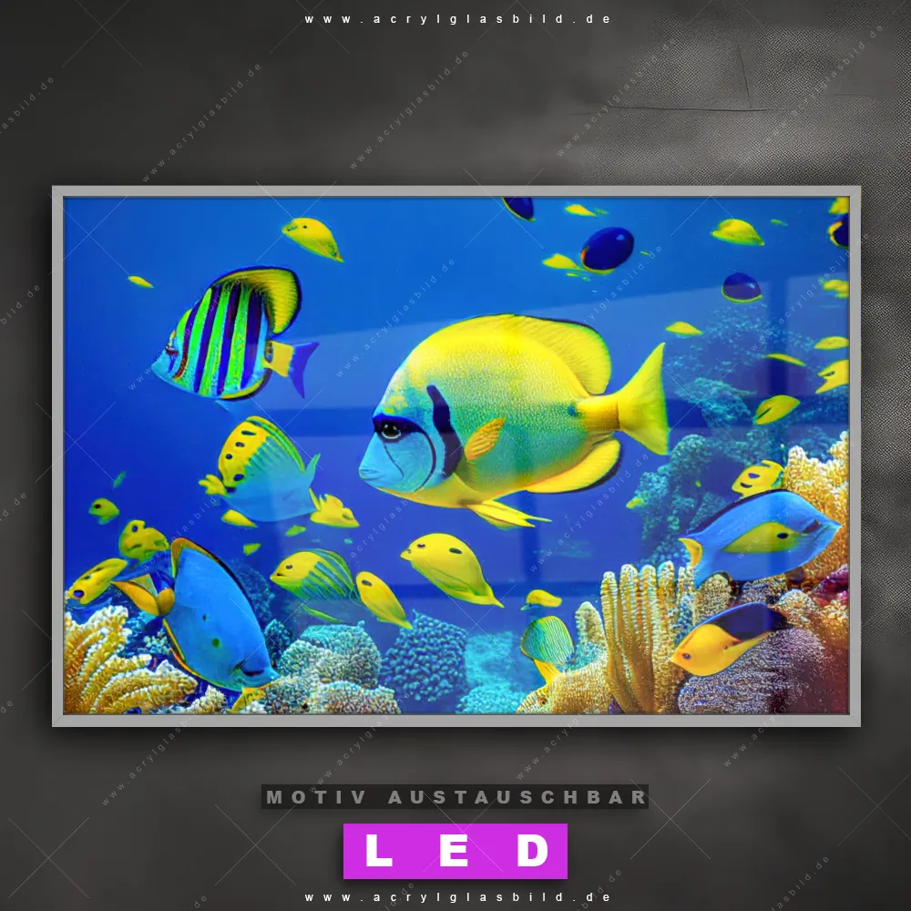 Du bist auf der Suche nach einem dimmbaren Strand - Meer, Tierwelt LED Bild mit Fernbedienung und optionaler Farbtemperatursteuerung? Dann haben wir hier genau das richtige Wandbild mit LED Beleuchtung für dich: Unser Canvalight® DIA LED Acrylglasbild Tropische Unterwasserwelt im Querformat mit austauschbarer bedruckter Acrylglas-Scheibe. Dieses Leuchtbild bringt sofort Partybeleuchtung in deine Räume!