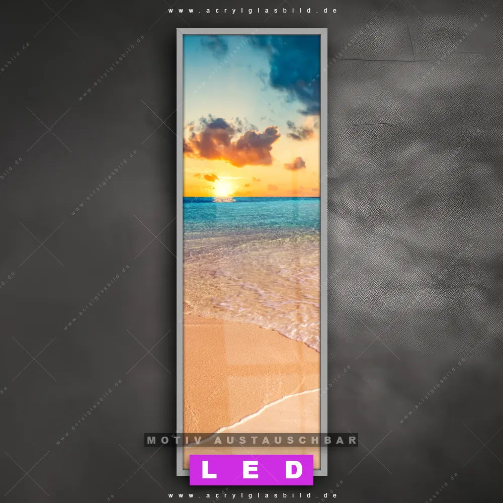 Bist du bereit, deine Wände mit einem dimmbaren LED Bild mit Fernbedienung und optionaler Farbtemperatursteuerung auf das nächste Level zu bringen? Unser Strand - Meer, Landschaften Canvalight® DIA LED Acrylglasbild ist genau das, was du brauchst! Das Wandbild mit LED Beleuchtung im Schmalen Format mit austauschbarer bedruckter Acrylglas-Scheibe Türkisfarbenes Meer bringt Licht und Stil in dein Zuhause – und das in null Komma nichts!