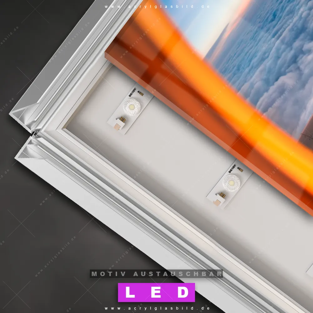 Du bist auf der Suche nach einem dimmbaren Fensterblick LED Bild mit Fernbedienung und optionaler Farbtemperatursteuerung? Dann haben wir hier genau das richtige Wandbild mit LED Beleuchtung für dich: Unser Canvalight® DIA LED Acrylglasbild Über den Wolken im Querformat mit austauschbarer bedruckter Acrylglas-Scheibe. Dieses Leuchtbild bringt sofort Partybeleuchtung in deine Räume!
