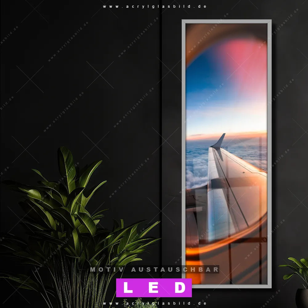 Bist du bereit, deine Wände mit einem dimmbaren LED Bild mit Fernbedienung und optionaler Farbtemperatursteuerung auf das nächste Level zu bringen? Unser Fensterblick Canvalight® DIA LED Acrylglasbild ist genau das, was du brauchst! Das Wandbild mit LED Beleuchtung im Schmalen Format mit austauschbarer bedruckter Acrylglas-Scheibe Über den Wolken bringt Licht und Stil in dein Zuhause – und das in null Komma nichts!