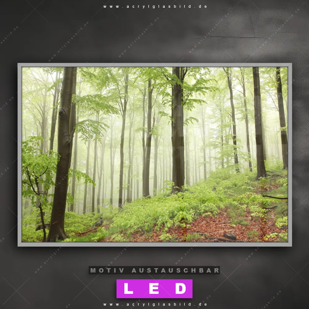 Mit unserem LED Acrylglasbild Canvalight® DIA Wald mit Buchen und seiner genialen LED-Ausleuchtung wirst du nie wieder im Dunkeln auf deinem Sofa herumtappen. Wenn du nach einem beleuchteten Wandbild aus Acrylglas mit Wald, Baum, Natur, Licht, Bäume, Laubwald, Baumstämme, Buchen, Nebel für Wohnzimmer - Schlafzimmer, Arzt - Praxis, Büro - Kanzlei, Flur - Eingangsbereich suchst, ist unser LED Leuchtbild Frühling im Wald in den beeindruckenden Motiv-Farben Grün, Braun, Hellgrün, Beige genau das richtige beleuchtete Wandbild für dich. Gestaltet im Natürlich - Realistisch Stil, passt dieses LED Wandbild mit DIA-Klapprahmen und glänzender Front aus Acrylglas perfekt zu jedem Einrichtungsstil – sogar zu deinem chaotischen kreativen Durcheinander!