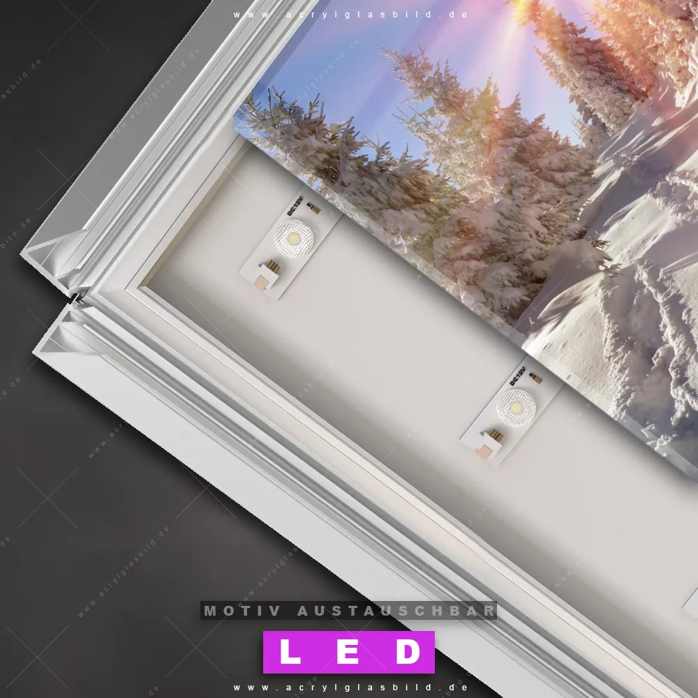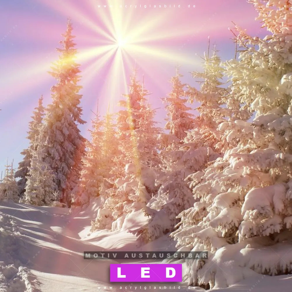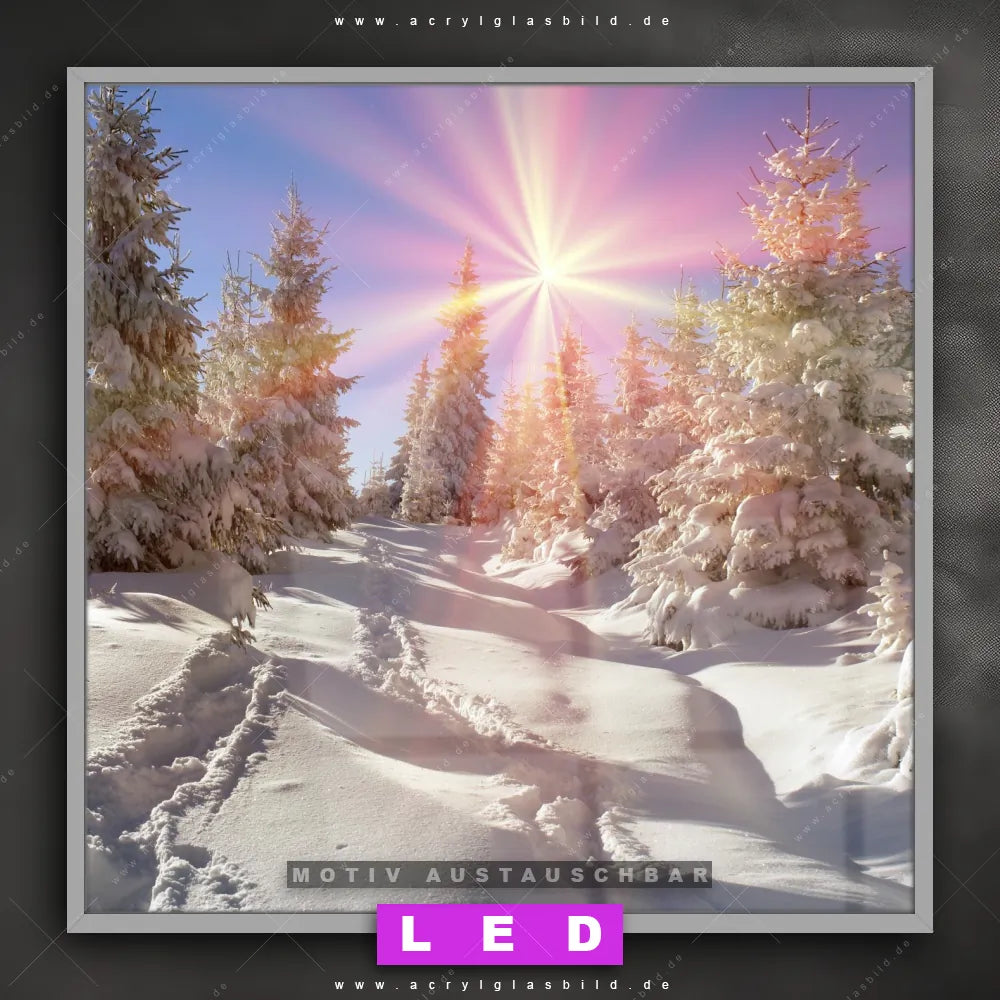 Also, worauf wartest du noch? Gib mit einem beleuchteten Wandbild mit wechselbarer Acrylglas-Scheibe deinen Wänden das gewisse Etwas und bestelle jetzt das LED Acrylglasbild Canvalight® DIA Sonnenaufgang in Schneelandschaft – dein Zuhause wird es dir danken und deine Freunde werden dank der wechselbaren Motive erblassen!
