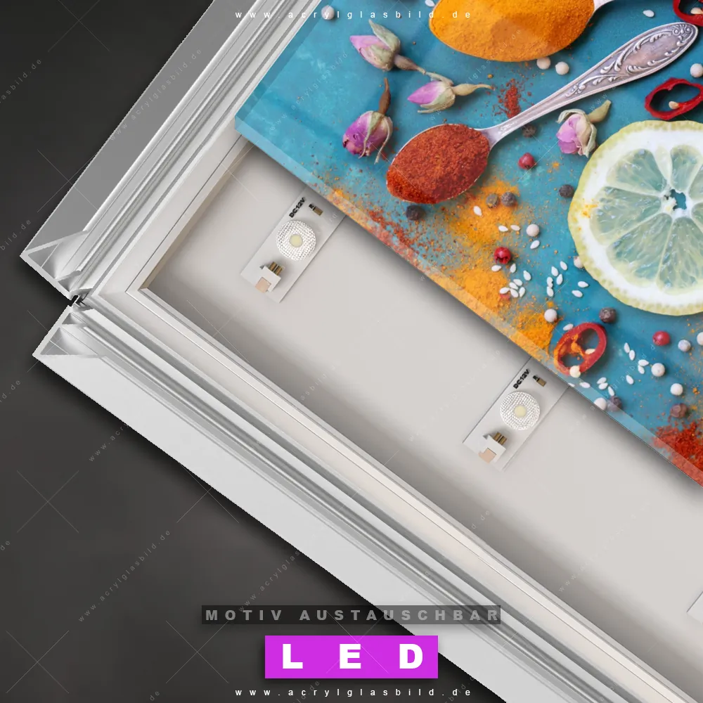 Also, worauf wartest du noch? Gib mit einem beleuchteten Wandbild mit wechselbarer Acrylglas-Scheibe deinen Wänden das gewisse Etwas und bestelle jetzt das LED Acrylglasbild Canvalight® DIA Gewürze und Kräuter auf alten Löffeln – dein Zuhause wird es dir danken und deine Freunde werden dank der wechselbaren Motive erblassen!