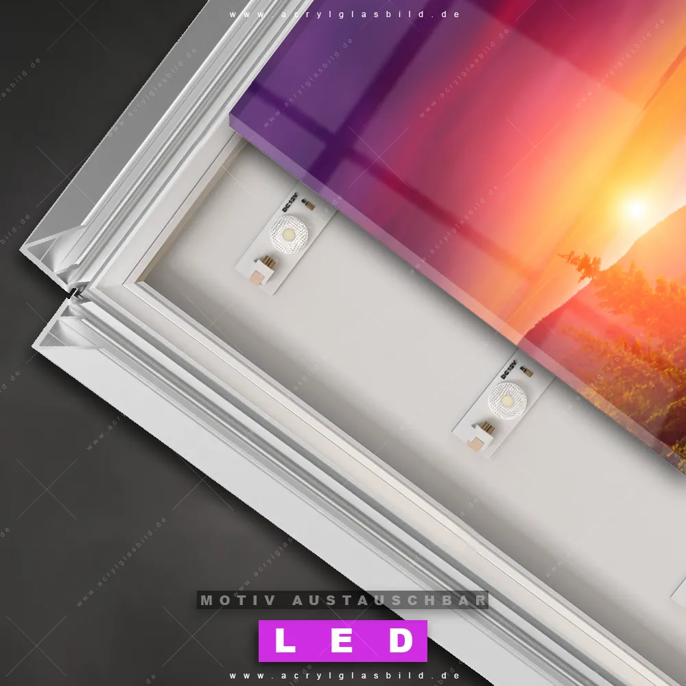 Du suchst nach einem Wandbild mit LED Beleuchtung als ultimativen Hingucker für deine Wände? Dann haben wir das perfekte dimmbare LED Bild mit Fernbedienung und optionaler Farbtemperatursteuerung für dich: unser abgefahrenes Landschaften, Wald - Bäume Canvalight® DIA LED Acrylglasbild! Mit dem LED Leuchtbild aus Acrylglas Wald bei Sonnenuntergang im Hochformat mit austauschbarer bedruckter Acrylglas-Scheibe bringst du nicht nur Licht, sondern auch ordentlich Stil in deine Bude.