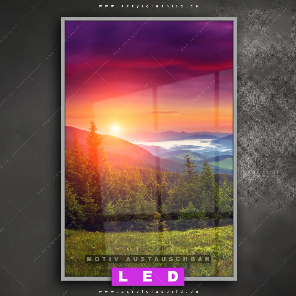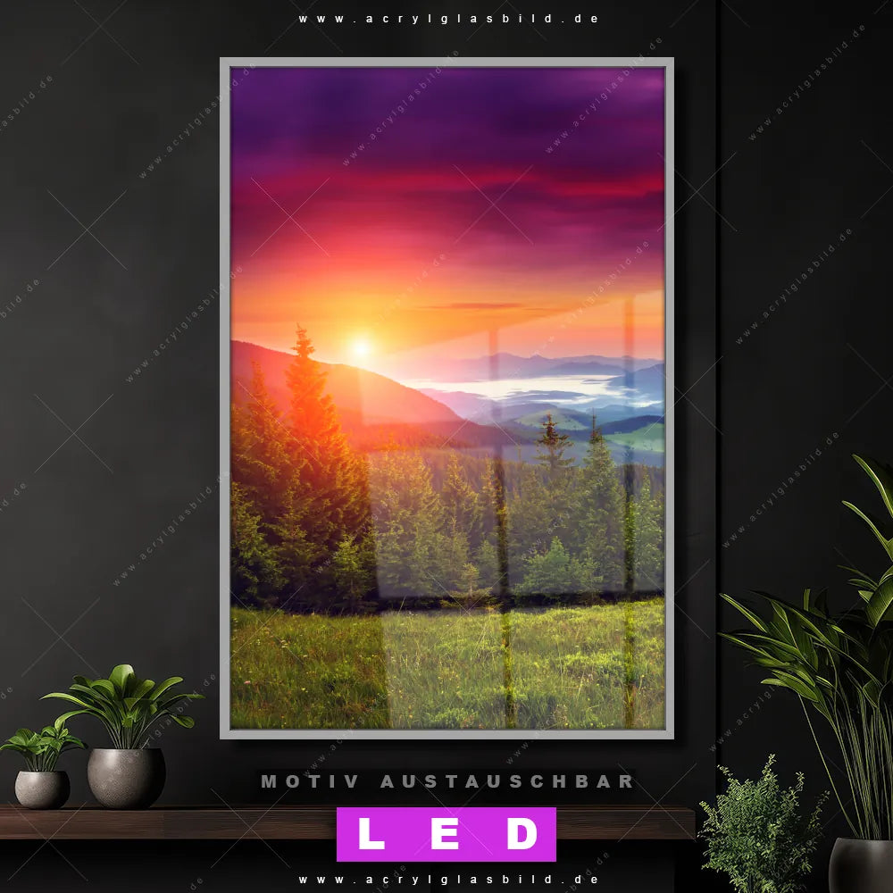 Wer braucht schon langweilige Wände, wenn man sie mit unserem LED Acrylglasbild Canvalight® DIA Sonnenuntergang über Waldlandschaft aufpeppen kann? Dank der genialen LED-Ausleuchtung wirst du in Arzt - Praxis, Bar - Gastronomie, Büro - Kanzlei, Flur - Eingangsbereich, Wohnzimmer - Schlafzimmer nie wieder über deine eigenen Füße stolpern. Wenn du nach einem beleuchteten Wandbild aus Acrylglas mit Wald, Landschaft, Bäume, Natur, Sonnenuntergang, Himmel, Tannen, Sonne suchst, dann ist unser LED Acrylglasbild Wald umhüllt von warmen Himmelsfarben in den hammermäßigen Motiv-Farben Grün, Orange, Lila genau das richtige LED Bild für dich. Im coolen Natürlich - Realistisch Stil gestaltet, passt das LED Leuchtbild mit DIA-Klapprahmen und glänzender Front aus Acrylglas perfekt zu jedem Einrichtungsstil – sogar zu deinem chaotischen Kreativlabor!