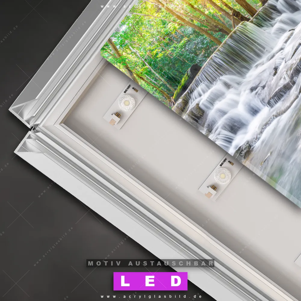 Also, worauf wartest du noch? Gib mit einem beleuchteten Wandbild mit wechselbarer Acrylglas-Scheibe deinen Wänden das gewisse Etwas und bestelle jetzt das LED Acrylglasbild Canvalight® DIA Kristallklarer Wasserfall in unberührtem Wald – dein Zuhause wird es dir danken und deine Freunde werden dank der wechselbaren Motive erblassen!