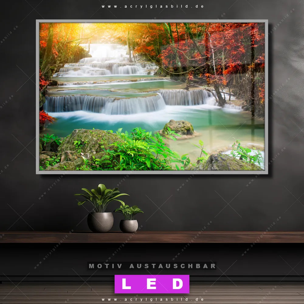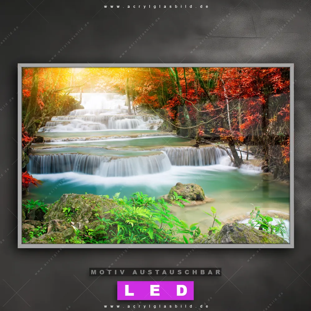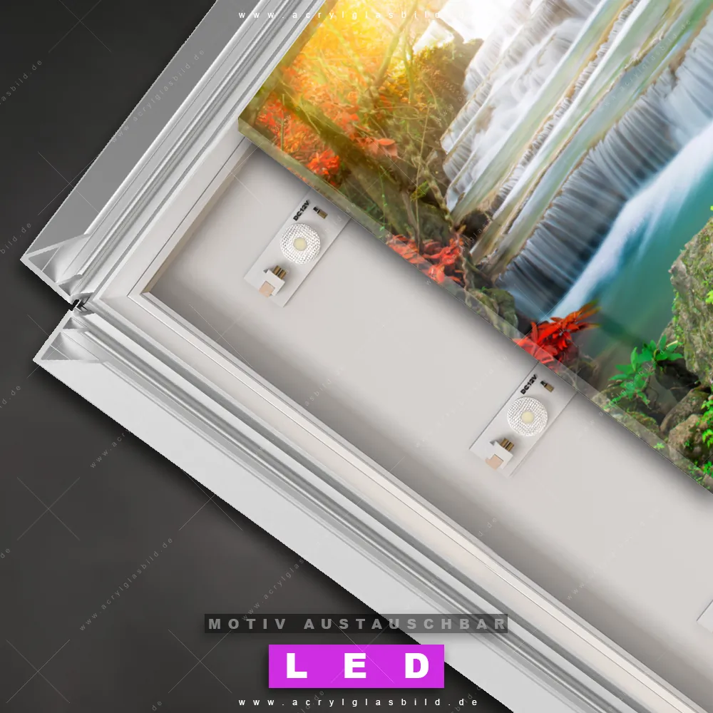Du bist auf der Suche nach einem dimmbaren Landschaften LED Bild mit Fernbedienung und optionaler Farbtemperatursteuerung? Dann haben wir hier genau das richtige Wandbild mit LED Beleuchtung für dich: Unser Canvalight® DIA LED Acrylglasbild Wald & Wasserfall No. 5 im Querformat mit austauschbarer bedruckter Acrylglas-Scheibe. Dieses Leuchtbild bringt sofort Partybeleuchtung in deine Räume!