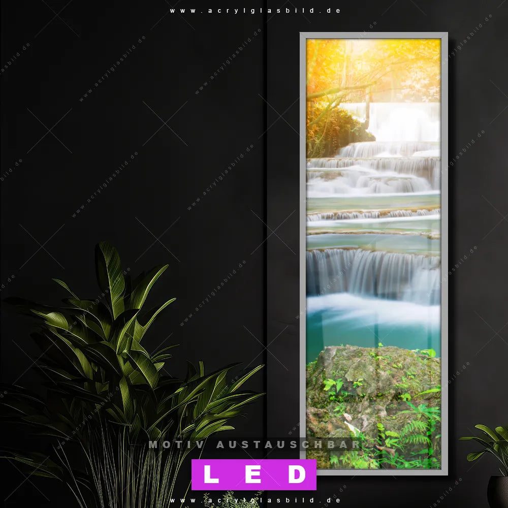 Bist du bereit, deine Wände mit einem dimmbaren LED Bild mit Fernbedienung und optionaler Farbtemperatursteuerung auf das nächste Level zu bringen? Unser Landschaften Canvalight® DIA LED Acrylglasbild ist genau das, was du brauchst! Das Wandbild mit LED Beleuchtung im Schmalen Format mit austauschbarer bedruckter Acrylglas-Scheibe Wald & Wasserfall No. 5 bringt Licht und Stil in dein Zuhause – und das in null Komma nichts!