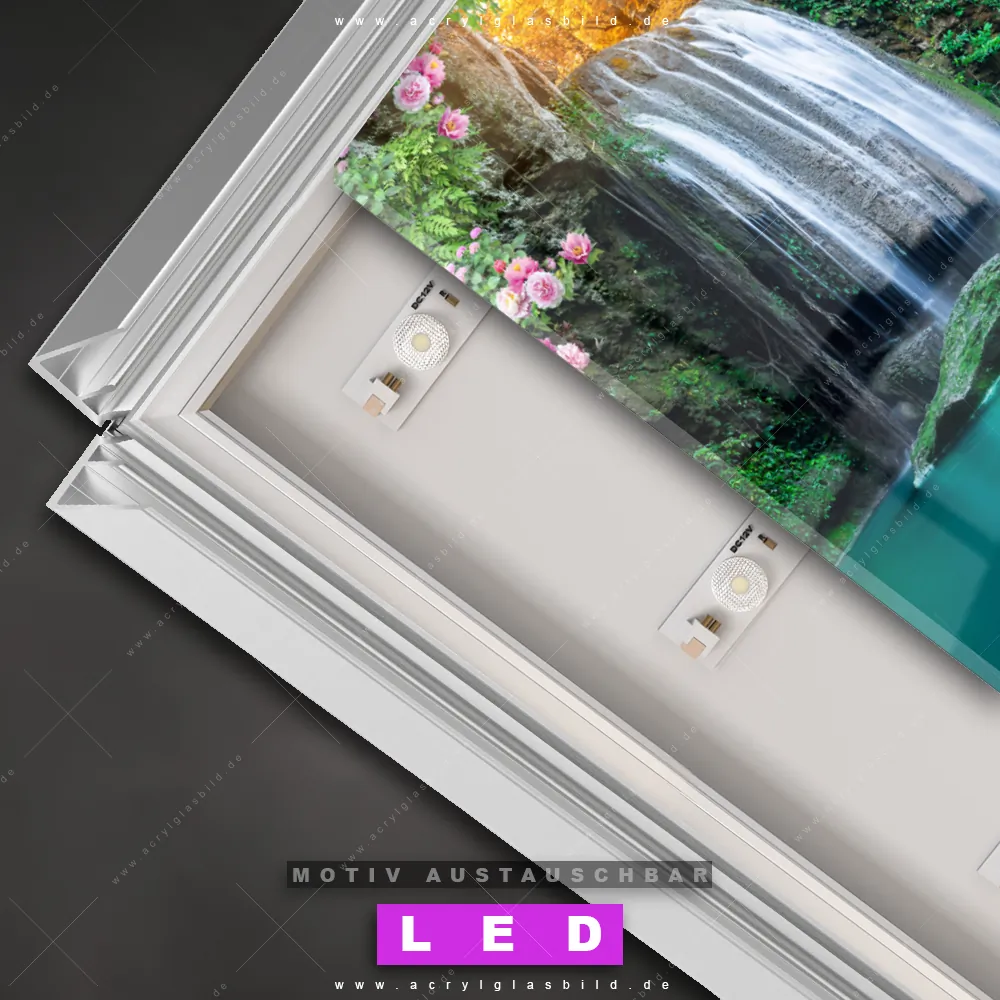 Du bist auf der Suche nach einem dimmbaren Landschaften LED Bild mit Fernbedienung und optionaler Farbtemperatursteuerung? Dann haben wir hier genau das richtige Wandbild mit LED Beleuchtung für dich: Unser Canvalight® DIA LED Acrylglasbild Wald & Wasserfall No. 7 im Querformat mit austauschbarer bedruckter Acrylglas-Scheibe. Dieses Leuchtbild bringt sofort Partybeleuchtung in deine Räume!