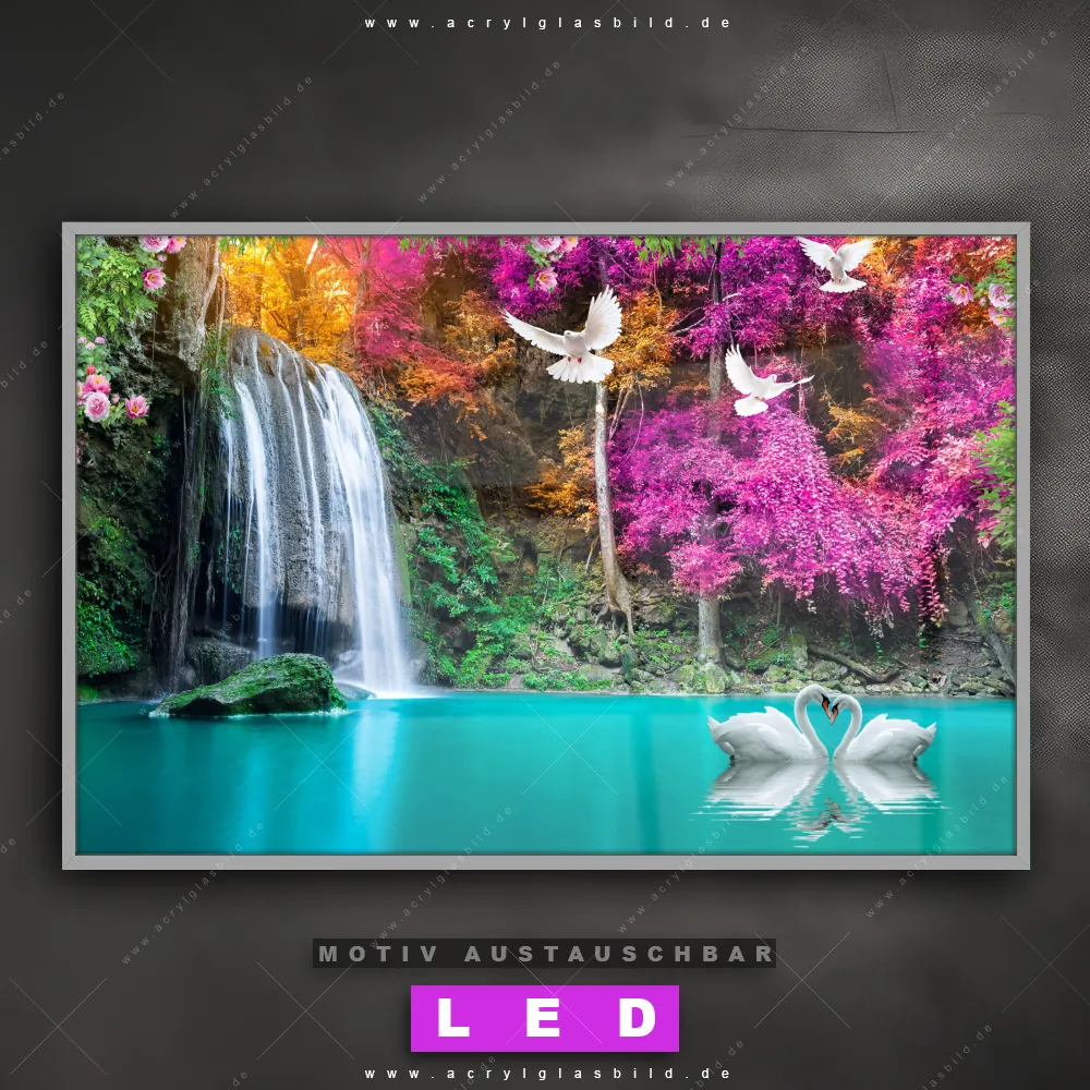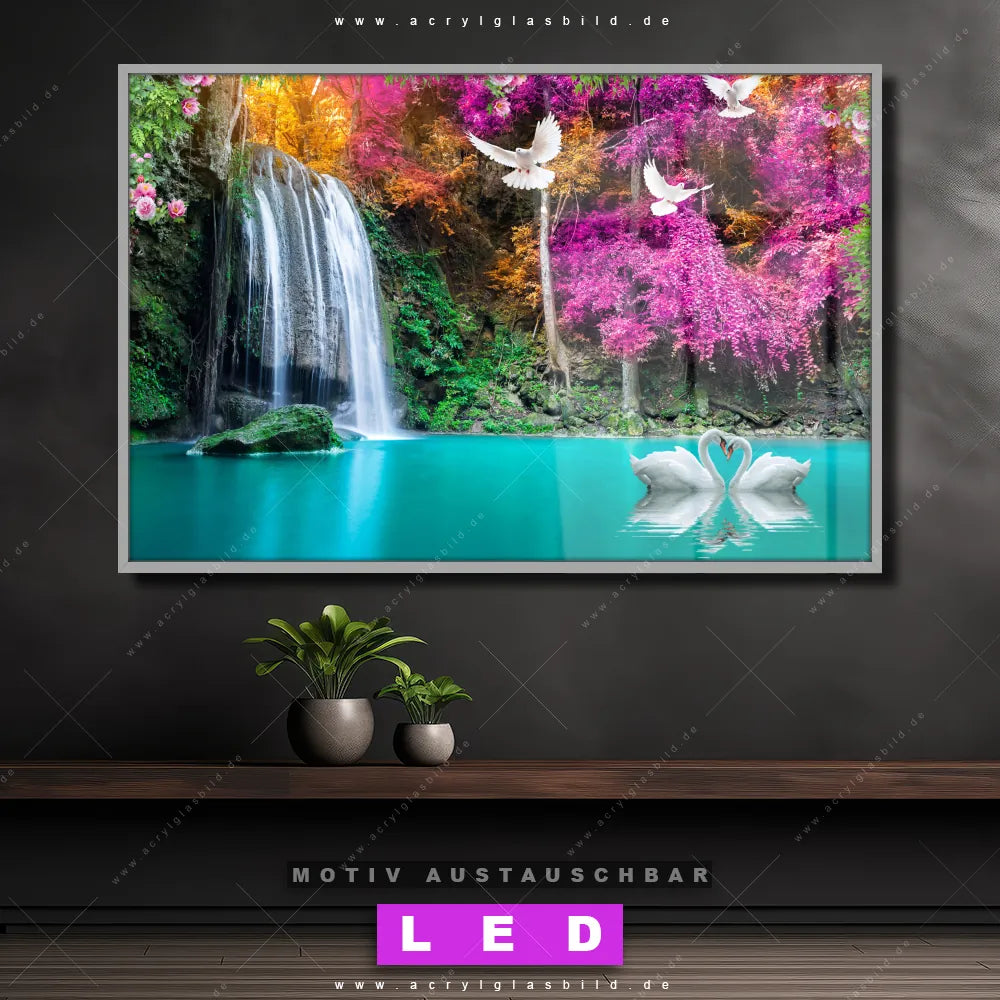 Mit unserem LED Acrylglasbild Canvalight® DIA Wasserfall mit Schwanenherz und seiner genialen LED-Ausleuchtung wirst du nie wieder im Dunkeln auf deinem Sofa herumtappen. Wenn du nach einem beleuchteten Wandbild aus Acrylglas mit Wald, Landschaft, Bäume, Natur, Baum, Ruhe, Stille, Wasserfall, Fluss, Tauben, Schwäne, See, Vögel für Arzt - Praxis, Büro - Kanzlei, Wohnzimmer - Schlafzimmer suchst, ist unser LED Leuchtbild Wasserfall mit Vögeln in den beeindruckenden Motiv-Farben Pink, Türkis genau das richtige beleuchtete Wandbild für dich. Gestaltet im Natürlich - Realistisch, Mixed Media Stil, passt dieses LED Wandbild mit DIA-Klapprahmen und glänzender Front aus Acrylglas perfekt zu jedem Einrichtungsstil – sogar zu deinem chaotischen kreativen Durcheinander!