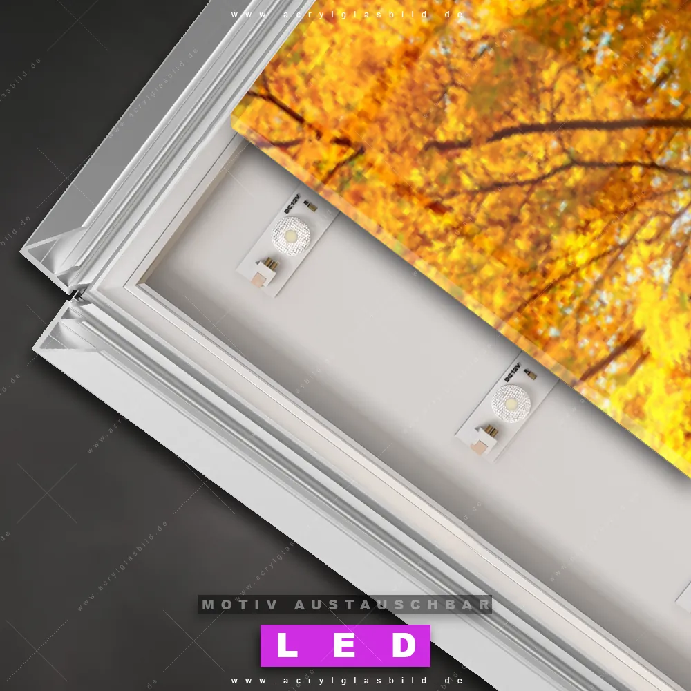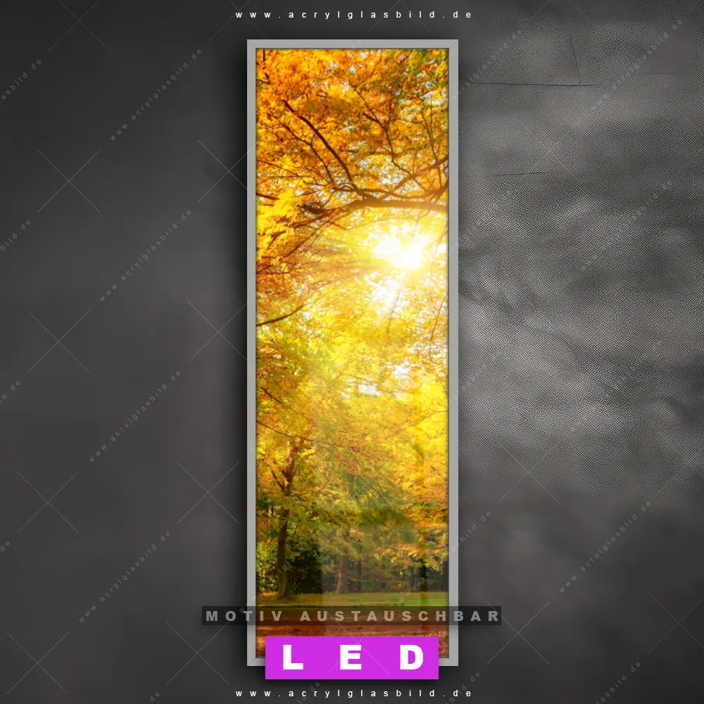 Bist du bereit, deine Wände mit einem dimmbaren LED Bild mit Fernbedienung und optionaler Farbtemperatursteuerung auf das nächste Level zu bringen? Unser Landschaften, Wald - Bäume Canvalight® DIA LED Acrylglasbild ist genau das, was du brauchst! Das Wandbild mit LED Beleuchtung im Schmalen Format mit austauschbarer bedruckter Acrylglas-Scheibe Waldlandschaft im Herbst bringt Licht und Stil in dein Zuhause – und das in null Komma nichts!