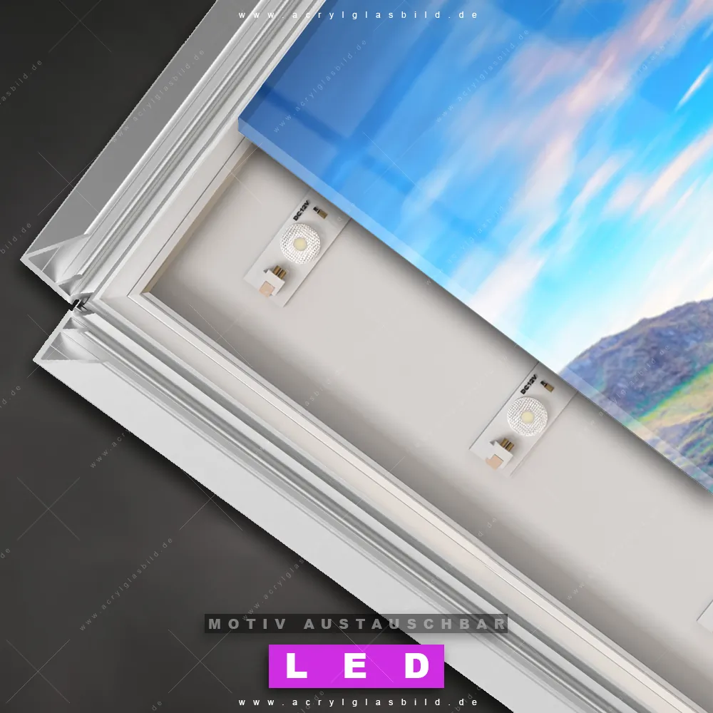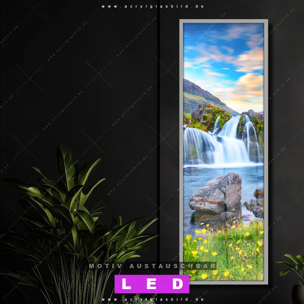 Bist du bereit, deine Wände mit einem dimmbaren LED Bild mit Fernbedienung und optionaler Farbtemperatursteuerung auf das nächste Level zu bringen? Unser Landschaften Canvalight® DIA LED Acrylglasbild ist genau das, was du brauchst! Das Wandbild mit LED Beleuchtung im Schmalen Format mit austauschbarer bedruckter Acrylglas-Scheibe Wasserfall bei Sonnenuntergang bringt Licht und Stil in dein Zuhause – und das in null Komma nichts!