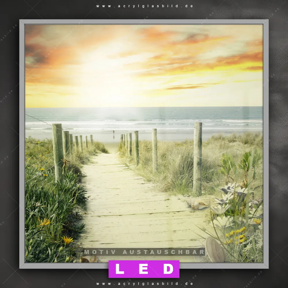 Bist du bereit, deine Wände mit einem dimmbaren LED Bild mit Fernbedienung und optionaler Farbtemperatursteuerung zum Leuchten zu bringen? Wir haben das ultimative Landschaften, Strand - Meer LED Acrylglasbild Canvalight® DIA für dich! Unser LED Wandbild aus Acrylglas Weg zum Strand im Quadratischen Format mit austauschbarer bedruckter Acrylglas-Scheibe im DIA-Klapprahmen bringt sofort jede Menge Glanz in deine vier Wände.