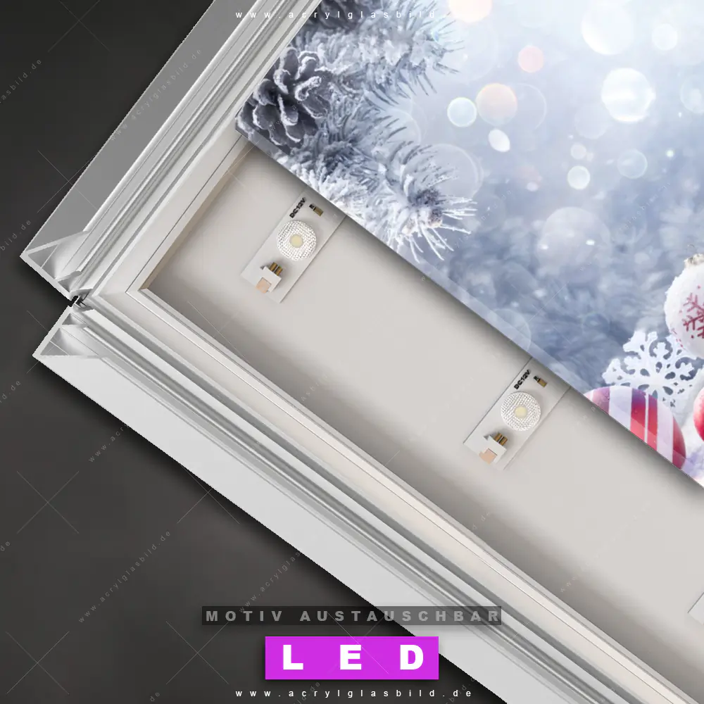 LED Acrylglasbild Canvalight® DIA | Weihnachtskugeln im Winterwunderland | Querformat
