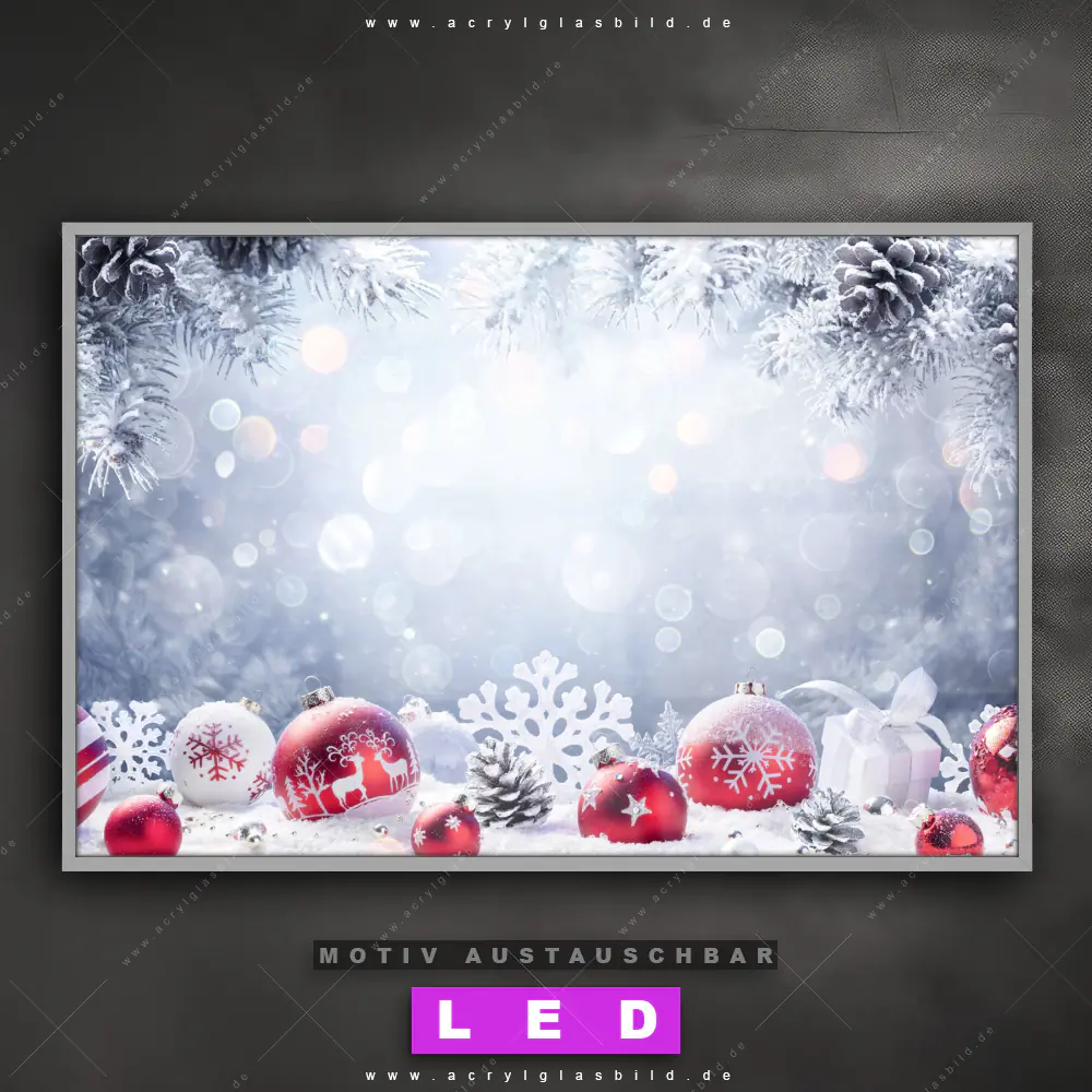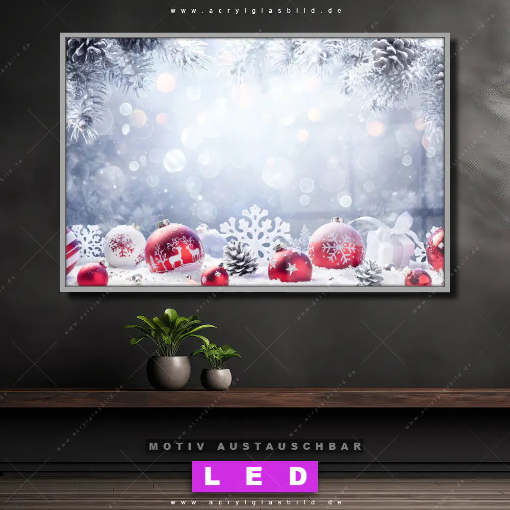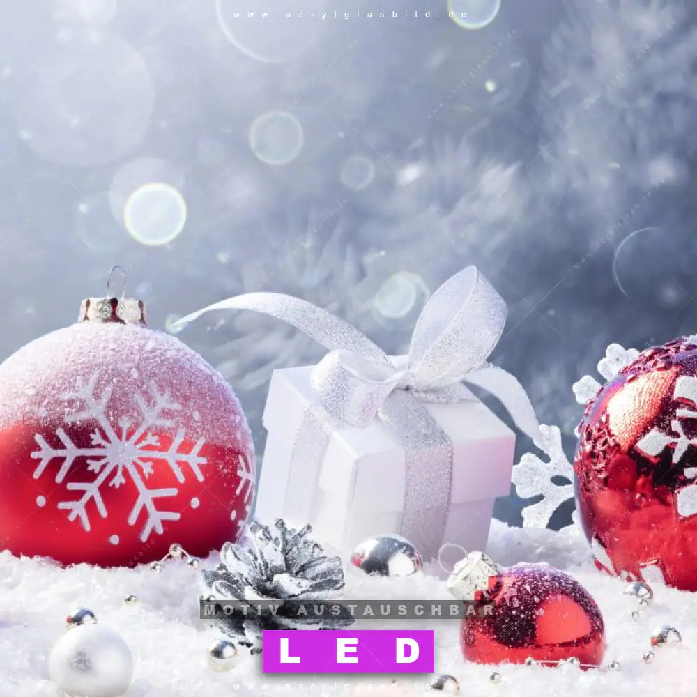 Mit unserem LED Acrylglasbild Canvalight® DIA Festliche Christbaumkugeln im Winter und seiner genialen LED-Ausleuchtung wirst du nie wieder im Dunkeln auf deinem Sofa herumtappen. Wenn du nach einem beleuchteten Wandbild aus Acrylglas mit Weihnachten, Geschenke, Weihnachtskugeln, Christbaumkugeln, Tannenzweige, Winter, Schneeflocken, Schnee, Tannenzapfen für Flur - Eingangsbereich, Wohnzimmer - Schlafzimmer, Arzt - Praxis, Büro - Kanzlei suchst, ist unser LED Leuchtbild Schneeflocken und Weihnachtskugeln in den beeindruckenden Motiv-Farben Weiss, Rot, Grau genau das richtige beleuchtete Wandbild für dich. Gestaltet im Minimalistisch, Modern Art Stil, passt dieses LED Wandbild mit DIA-Klapprahmen und glänzender Front aus Acrylglas perfekt zu jedem Einrichtungsstil – sogar zu deinem chaotischen kreativen Durcheinander!