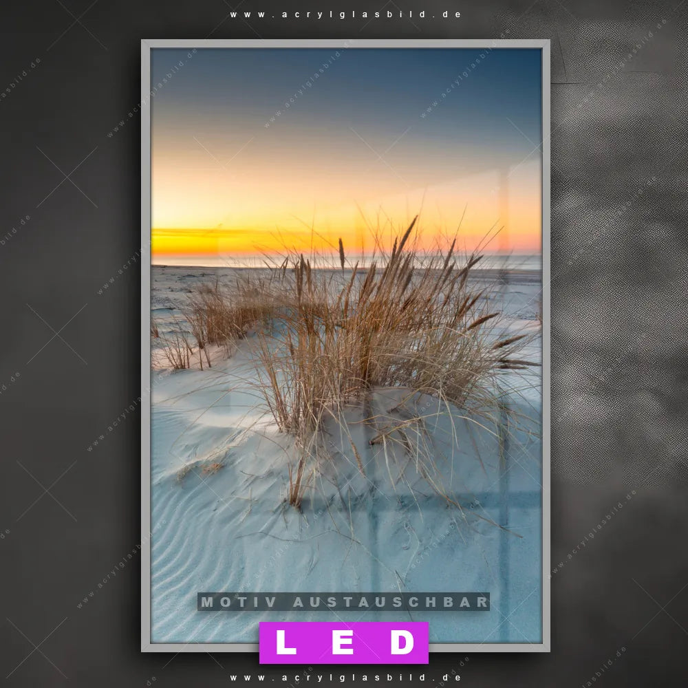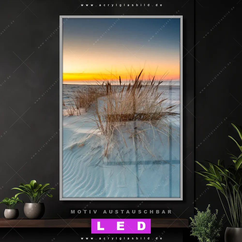 Wer braucht schon langweilige Wände, wenn man sie mit unserem LED Acrylglasbild Canvalight® DIA Sonnenuntergang über weißen Dünen aufpeppen kann? Dank der genialen LED-Ausleuchtung wirst du in Wohnzimmer - Schlafzimmer, Arzt - Praxis, Bar - Gastronomie, Büro - Kanzlei nie wieder über deine eigenen Füße stolpern. Wenn du nach einem beleuchteten Wandbild aus Acrylglas mit Deutschland, Sommer, Dünen, Gräser, Sonnenuntergang - Sonnenaufgang, Urlaub - Reisen, Ostsee - Nordsee suchst, dann ist unser LED Acrylglasbild Stranddünen in Abendstimmung in den hammermäßigen Motiv-Farben Blau, Weiss, Orange genau das richtige LED Bild für dich. Im coolen Natürlich - Realistisch Stil gestaltet, passt das LED Leuchtbild mit DIA-Klapprahmen und glänzender Front aus Acrylglas perfekt zu jedem Einrichtungsstil – sogar zu deinem chaotischen Kreativlabor!