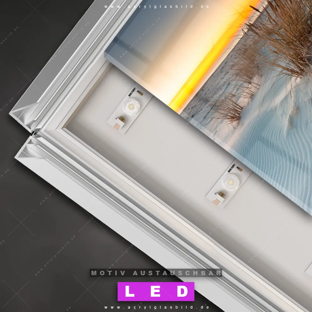 Also, worauf wartest du noch? Gib mit einem beleuchteten Wandbild mit wechselbarer Acrylglas-Scheibe deinen Wänden das gewisse Etwas und bestelle jetzt das LED Acrylglasbild Canvalight® DIA Goldene Stunde am Meer – dein Zuhause wird es dir danken und deine Freunde werden dank der wechselbaren Motive erblassen!