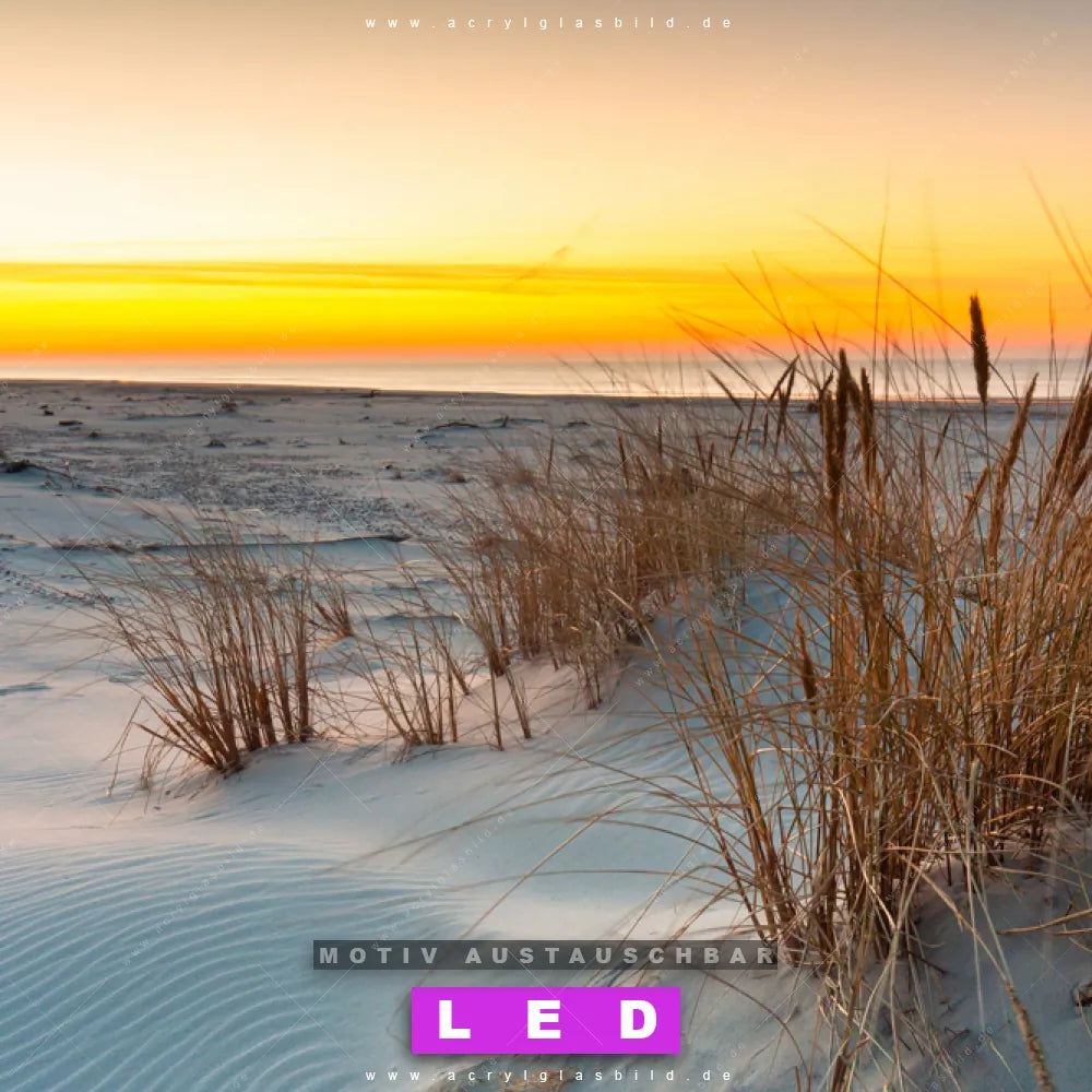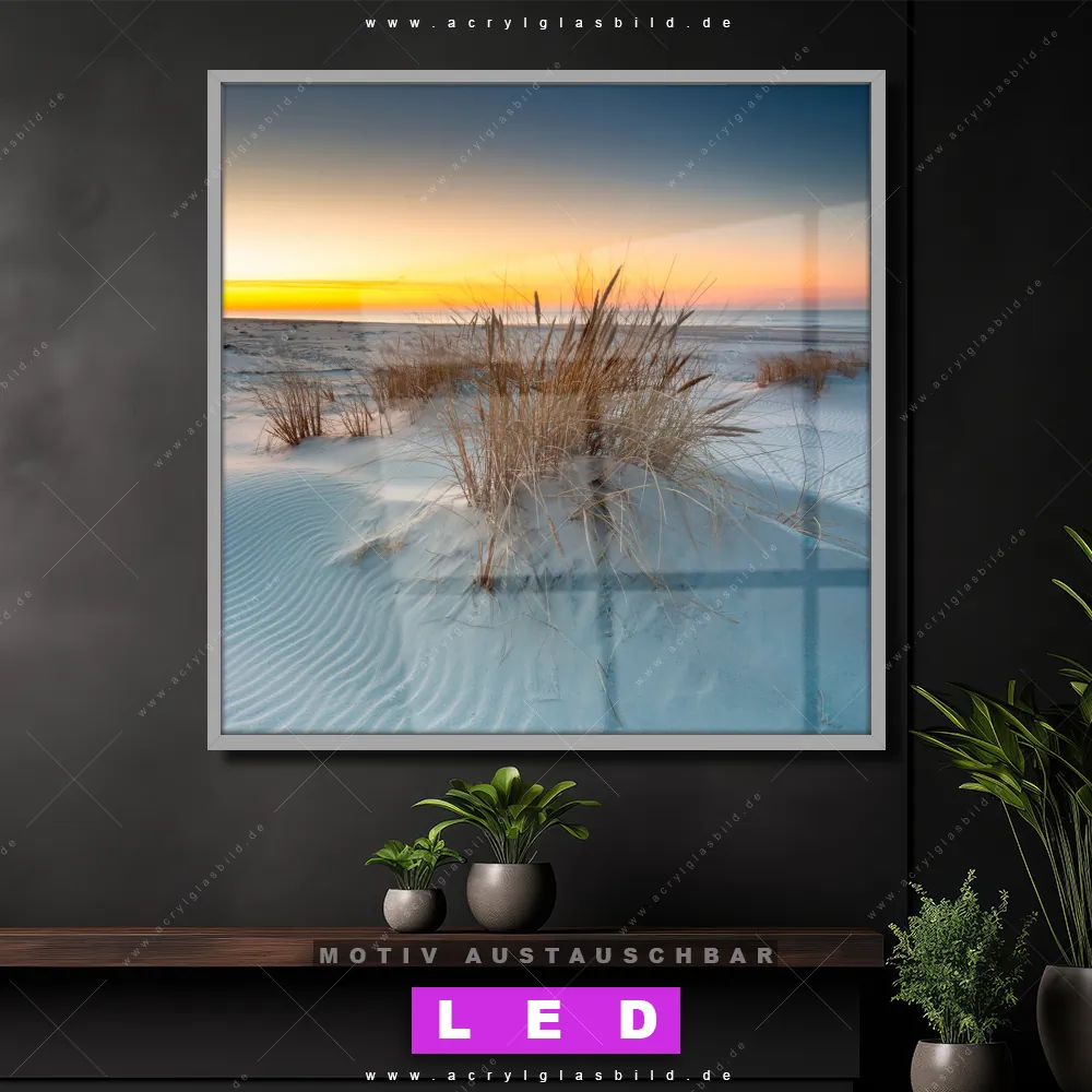 Vergiss dunkle Ecken und Langeweile! Mit unserem Acrylglasbild Sonnenuntergang über weißen Dünen und seiner brillanten LED-Ausleuchtung wirst du dich nie wieder in der Dunkelheit verirren. Wenn du auf der Suche nach einem beleuchteten Wandbild aus Acrylglas mit Deutschland, Sommer, Dünen, Gräser, Sonnenuntergang - Sonnenaufgang, Urlaub - Reisen, Ostsee - Nordsee bist, ist unser LED Acrylglasbild Canvalight® DIA Stranddünen in Abendstimmung mit den strahlenden Motiv-Farben Blau, Weiss, Orange genau das richtige Leuchtbild für dich. Das im Natürlich - Realistisch Stil gestaltete LED Bild mit glänzender Front aus Acrylglas passt perfekt zu jedem Einrichtungsstil in Wohnzimmer - Schlafzimmer, Arzt - Praxis, Bar - Gastronomie, Büro - Kanzlei – vom minimalistischen Chic bis zum kreativen Chaos.