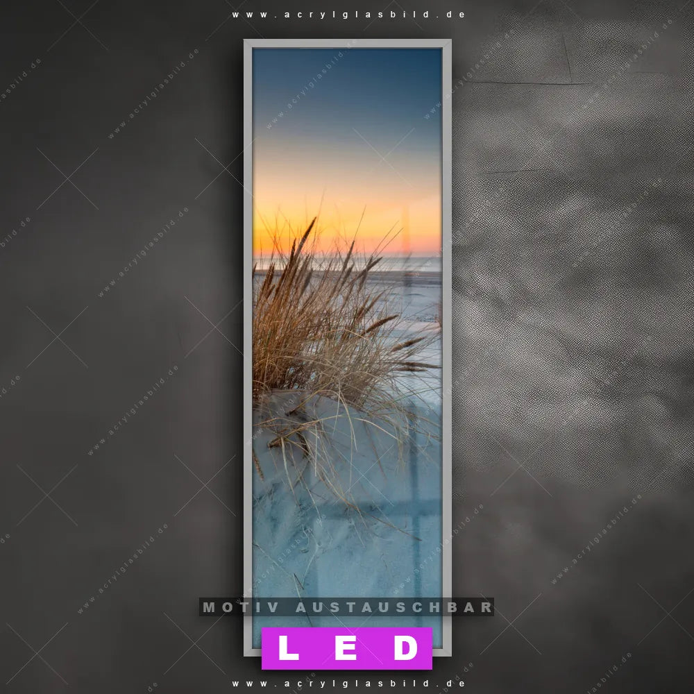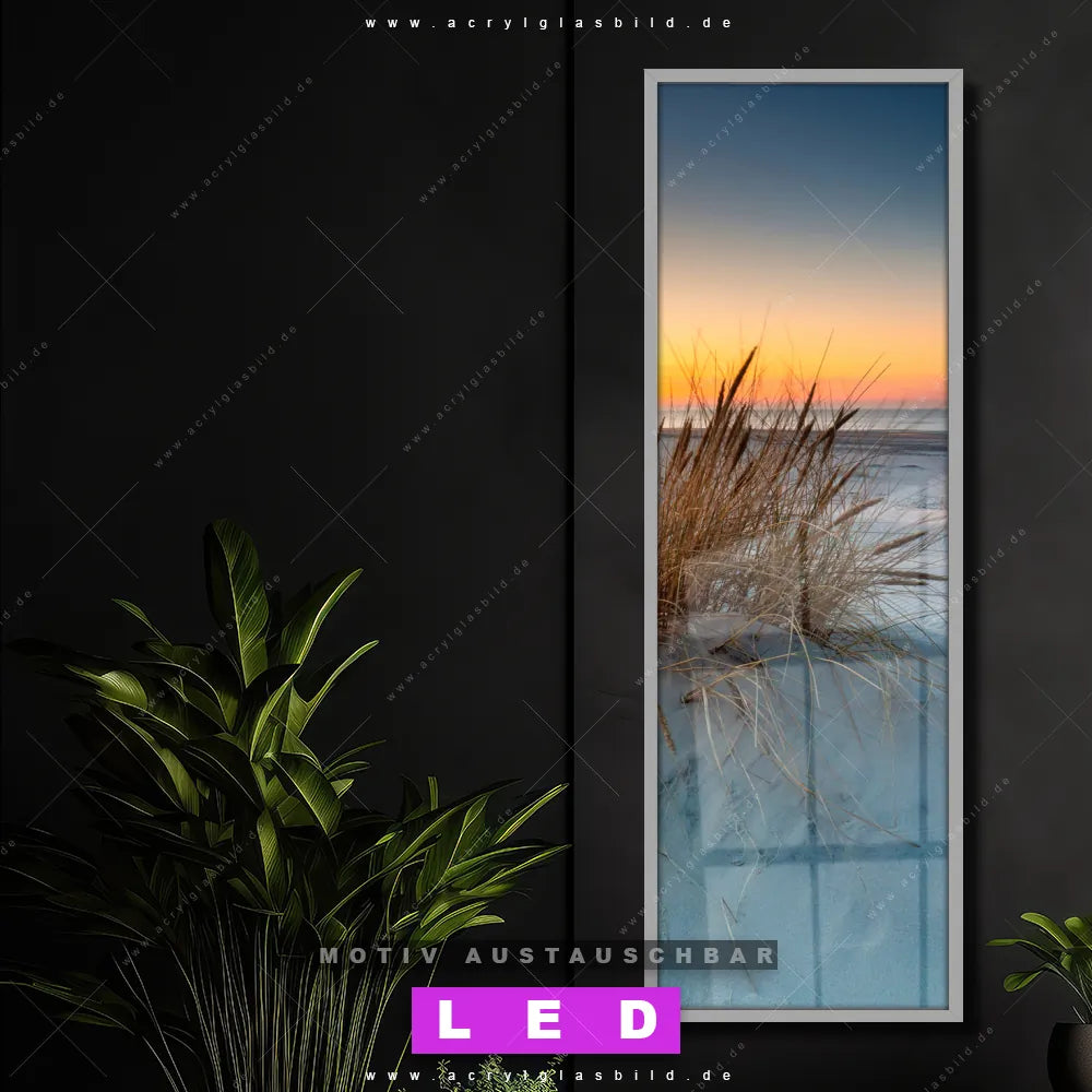 Bist du bereit, deine Wände mit einem dimmbaren LED Bild mit Fernbedienung und optionaler Farbtemperatursteuerung auf das nächste Level zu bringen? Unser Strand - Meer, Landschaften Canvalight® DIA LED Acrylglasbild ist genau das, was du brauchst! Das Wandbild mit LED Beleuchtung im Schmalen Format mit austauschbarer bedruckter Acrylglas-Scheibe Weiße Dünen bringt Licht und Stil in dein Zuhause – und das in null Komma nichts!