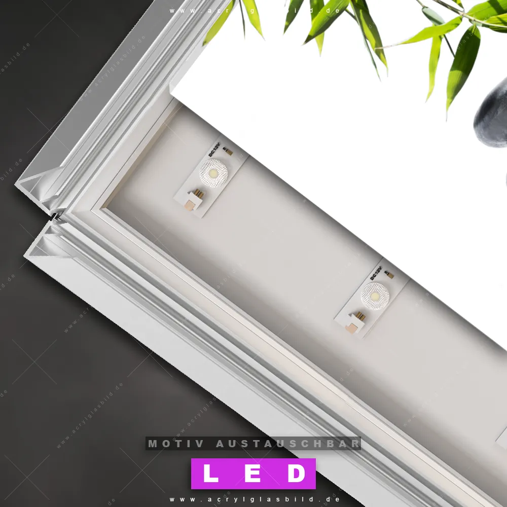 Na, worauf wartest du noch? Mach deine Wände zum Star der Show und bestelle jetzt das Canvalight® DIA LED Acrylglasbild weiße Blüte lehnt an Zen-Steinen im Wasser. Deine Wände werden es dir danken und deine Freunde werden dank der wechselbaren Motive vor Neid platzen!