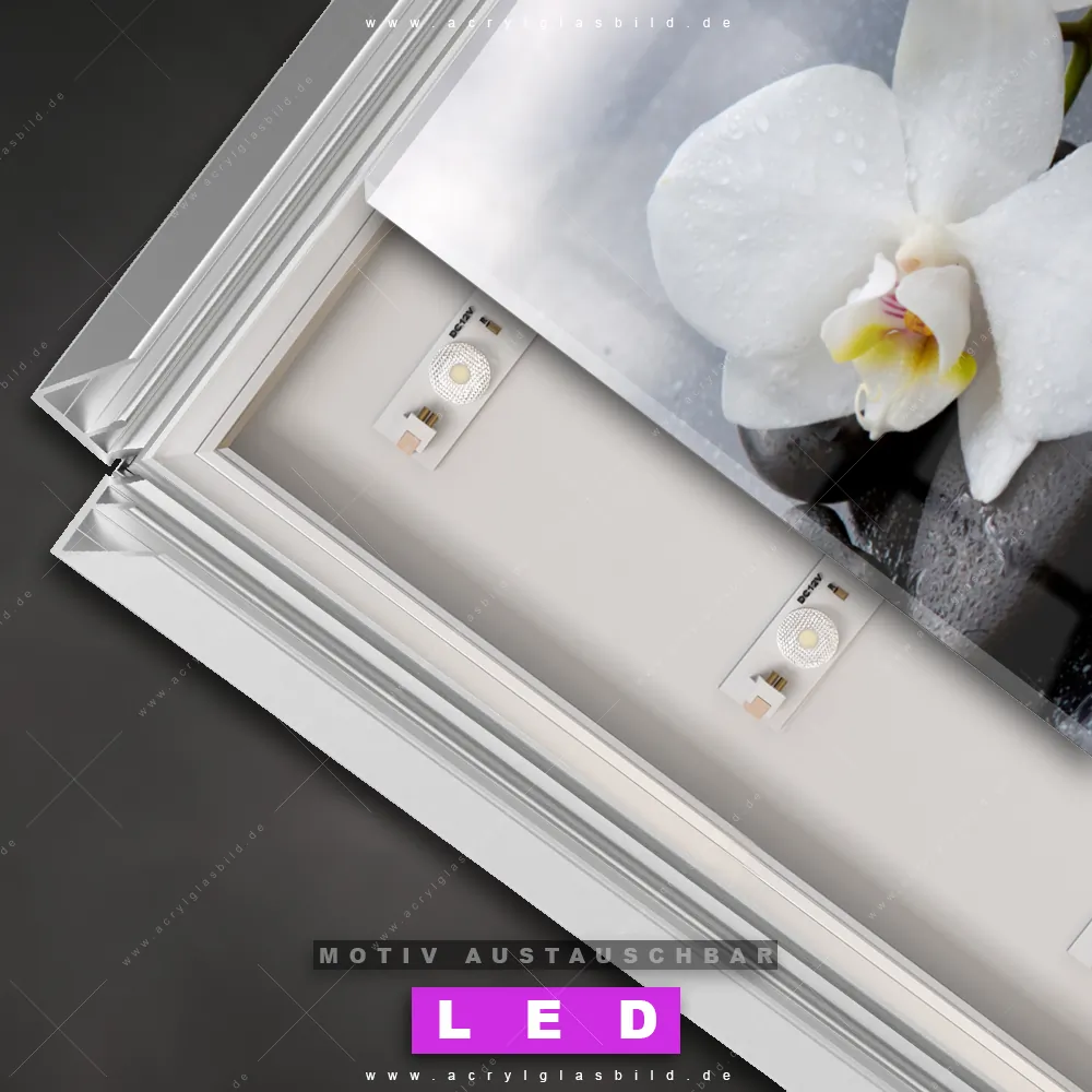 Also, worauf wartest du noch? Gib mit einem beleuchteten Wandbild mit wechselbarer Acrylglas-Scheibe deinen Wänden das gewisse Etwas und bestelle jetzt das LED Acrylglasbild Canvalight® DIA weiße Orchideenblüten – dein Zuhause wird es dir danken und deine Freunde werden dank der wechselbaren Motive erblassen!