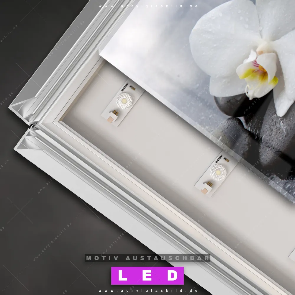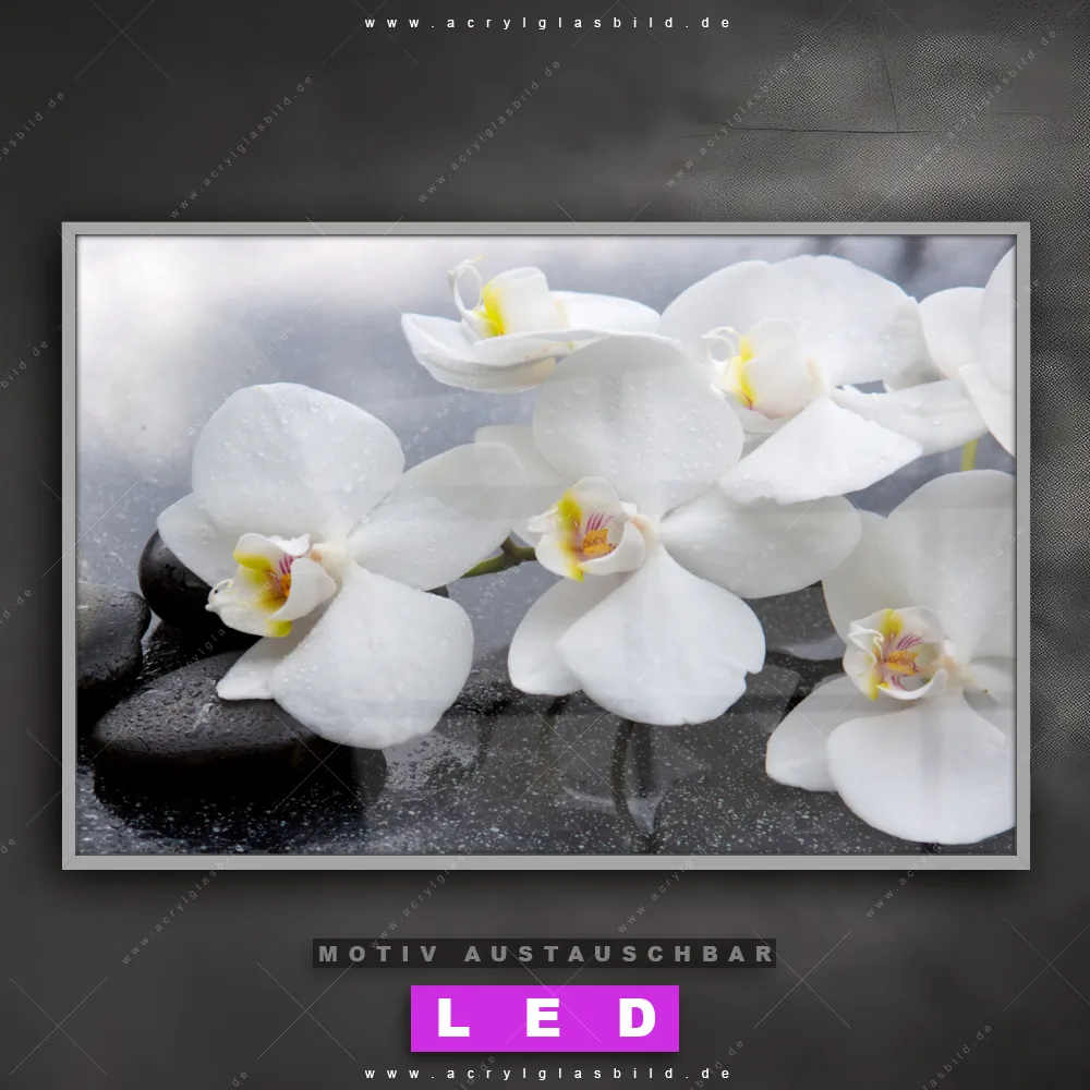 Du bist auf der Suche nach einem dimmbaren Blumen - Botanik, Buddha - Feng Shui LED Bild mit Fernbedienung und optionaler Farbtemperatursteuerung? Dann haben wir hier genau das richtige Wandbild mit LED Beleuchtung für dich: Unser Canvalight® DIA LED Acrylglasbild Weiße Orchideen im Querformat mit austauschbarer bedruckter Acrylglas-Scheibe. Dieses Leuchtbild bringt sofort Partybeleuchtung in deine Räume!