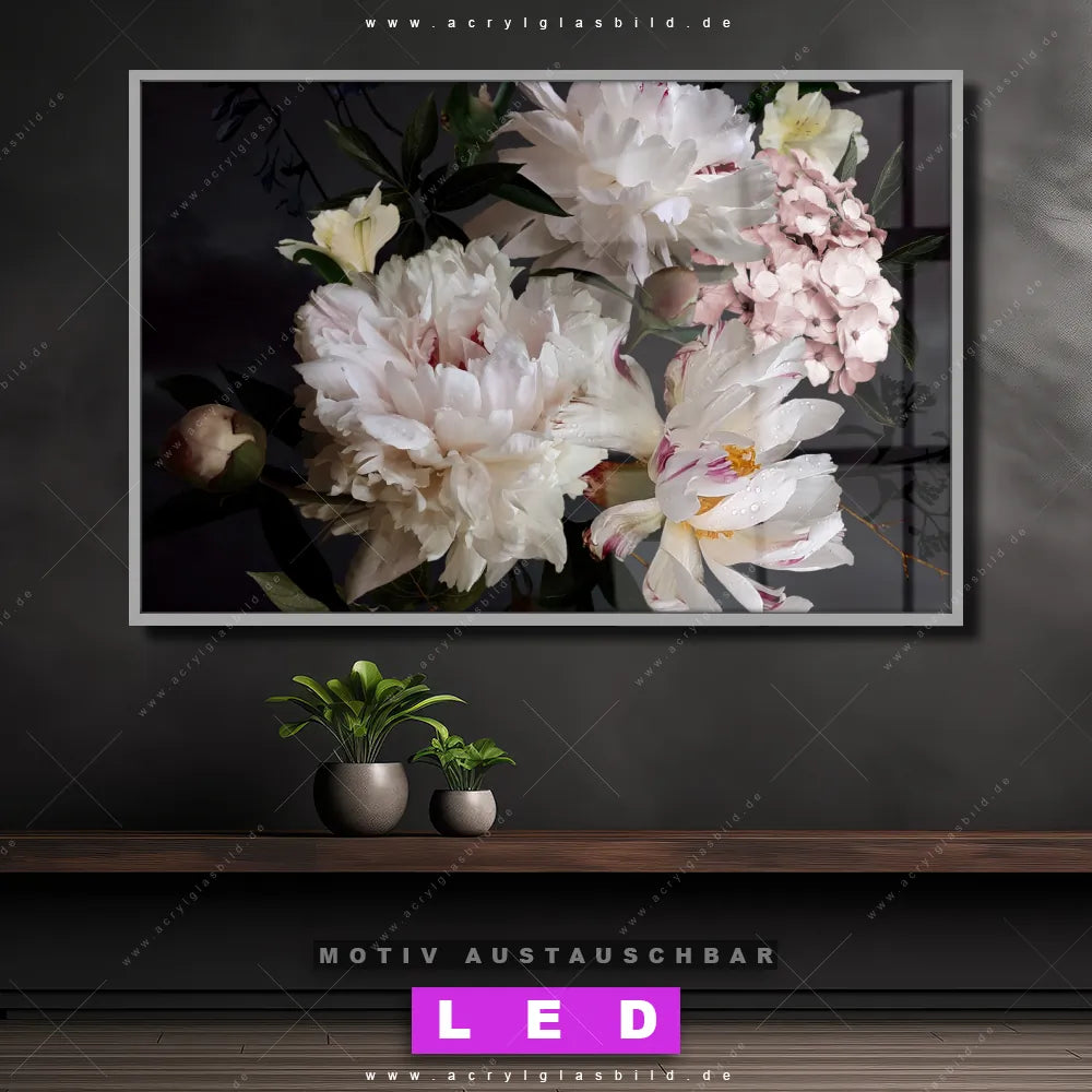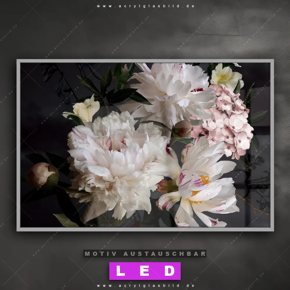 Du bist auf der Suche nach einem dimmbaren Blumen - Botanik LED Bild mit Fernbedienung und optionaler Farbtemperatursteuerung? Dann haben wir hier genau das richtige Wandbild mit LED Beleuchtung für dich: Unser Canvalight® DIA LED Acrylglasbild Weiße Pfingstrosen im Querformat mit austauschbarer bedruckter Acrylglas-Scheibe. Dieses Leuchtbild bringt sofort Partybeleuchtung in deine Räume!