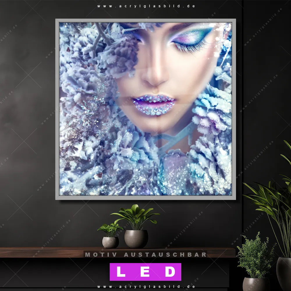 Vergiss dunkle Ecken und Langeweile! Mit unserem Acrylglasbild Eisprinzessin und seiner brillanten LED-Ausleuchtung wirst du dich nie wieder in der Dunkelheit verirren. Wenn du auf der Suche nach einem beleuchteten Wandbild aus Acrylglas mit Frau, Lippen, Mund, Porträt, modern, Beauty, Winter, Schnee, Gesicht, Eiszapfen, Weihnachten, Make-up, Schneeflocken bist, ist unser LED Acrylglasbild Canvalight® DIA Eiskönigin mit den strahlenden Motiv-Farben Beige, Blau, Lila, Hellblau genau das richtige Leuchtbild für dich. Das im Mixed Media, Modern Art Stil gestaltete LED Bild mit glänzender Front aus Acrylglas passt perfekt zu jedem Einrichtungsstil in Bar - Gastronomie, Arzt - Praxis, Friseur - Beauty, Wohnzimmer - Schlafzimmer – vom minimalistischen Chic bis zum kreativen Chaos.