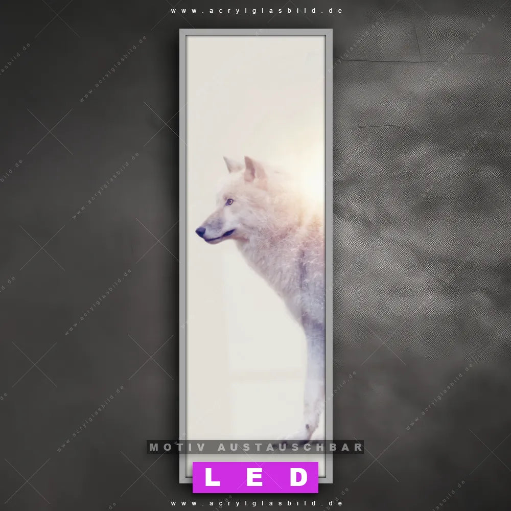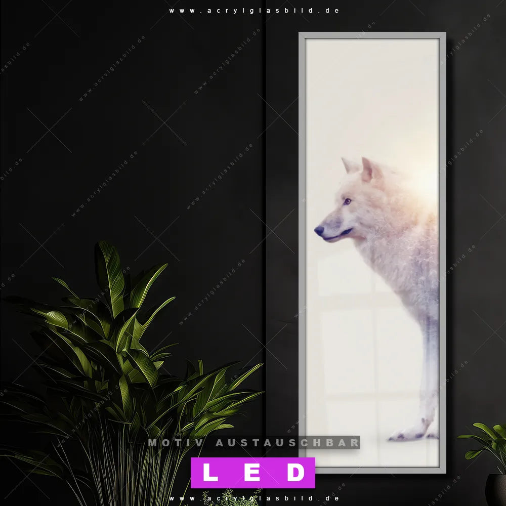 Bist du bereit, deine Wände mit einem dimmbaren LED Bild mit Fernbedienung und optionaler Farbtemperatursteuerung auf das nächste Level zu bringen? Unser Tierwelt Canvalight® DIA LED Acrylglasbild ist genau das, was du brauchst! Das Wandbild mit LED Beleuchtung im Schmalen Format mit austauschbarer bedruckter Acrylglas-Scheibe Wolf & Wald No.1 bringt Licht und Stil in dein Zuhause – und das in null Komma nichts!