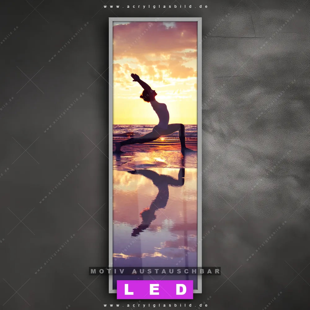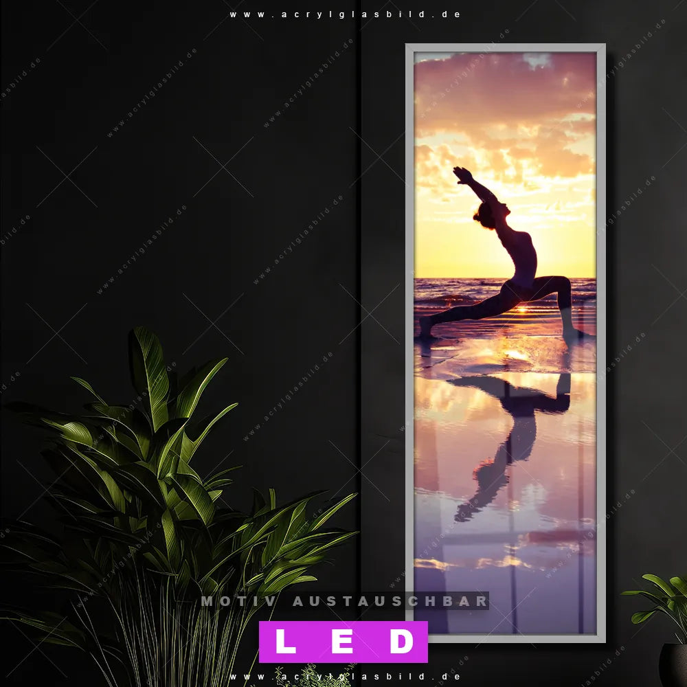 Bist du bereit, deine Wände mit einem dimmbaren LED Bild mit Fernbedienung und optionaler Farbtemperatursteuerung auf das nächste Level zu bringen? Unser Strand - Meer, Sport - Freizeit, Porträts - Menschen, Landschaften Canvalight® DIA LED Acrylglasbild ist genau das, was du brauchst! Das Wandbild mit LED Beleuchtung im Schmalen Format mit austauschbarer bedruckter Acrylglas-Scheibe Yoga am lila Strand bringt Licht und Stil in dein Zuhause – und das in null Komma nichts!