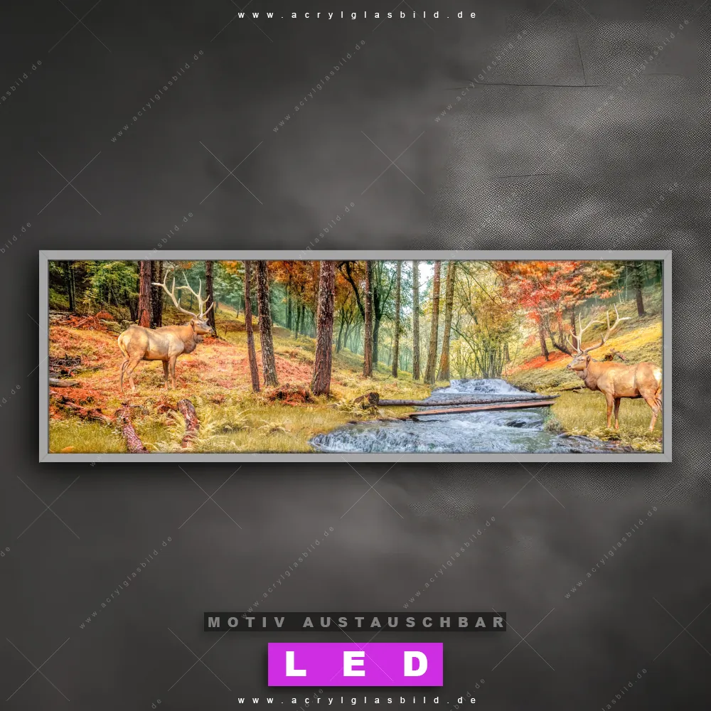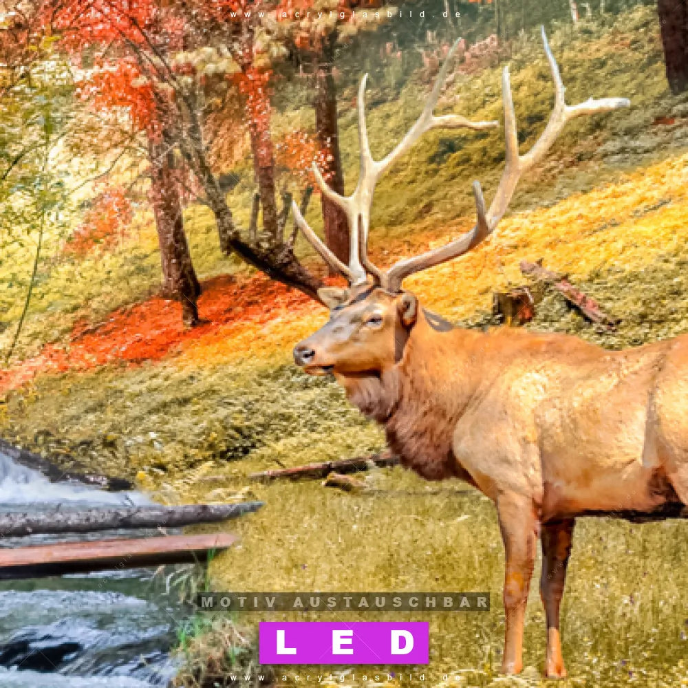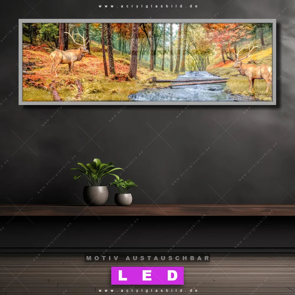 Wer will schon dunkle, triste Wände? Mit unserem LED Acrylglasbild Canvalight® DIA Herbstwald mit Hirschen und seiner fantastischen LED-Ausleuchtung werden deine Wände in Arzt - Praxis, Bar - Gastronomie, Büro - Kanzlei, Flur - Eingangsbereich, Wohnzimmer - Schlafzimmer zu echten Hinguckern. Wenn du auf der Suche nach einem beleuchteten Wandbild aus Acrylglas mit Wald, Landschaft, Bäume, Natur, Hirsch, Deer, Wild, Rotwild, Fluss, Strom bist, dann solltest du unser LED Leuchhtbild fließender Bach im Wald mit Wild mit den beeindruckenden Motiv-Farben Beige, Braun, Blau, Gelb , Grün, Hellblau, Hellgrün, Rot nicht verpassen. Gestaltet im angesagten Modern Art Stil, passt das LED Bild mit DIA-Klapprahmen und wechselbarer Acrylglas-Scheibe perfekt zu jedem Einrichtungsstil – selbst in deinem kleinen Dschungel aus Kreativität und Chaos!